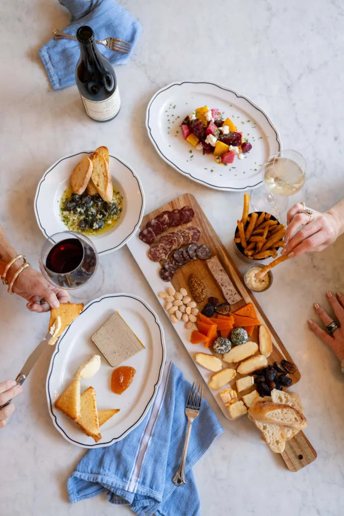 A variety of French Magnolia’s starters, including a charcuterie and fromage board, chilled beets l ’orange, baked escargot, duck foie gras mousse, and duck fat truffle fries.