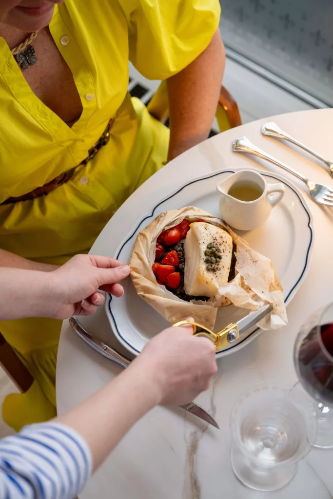Fraley’s poisson en papillote with wild-caught Chilean sea bass is a culinary experience, delivered in parchment paper and finished with an herb butter sauce at the table.