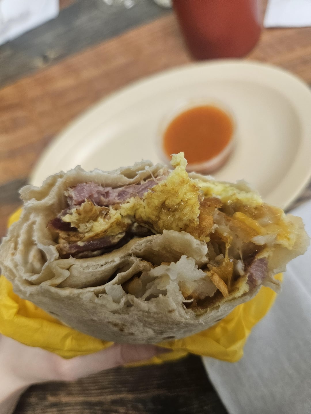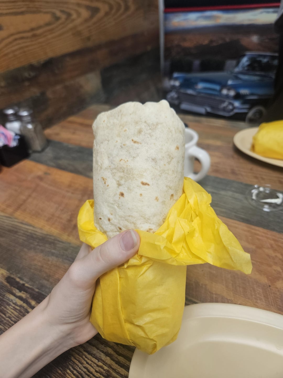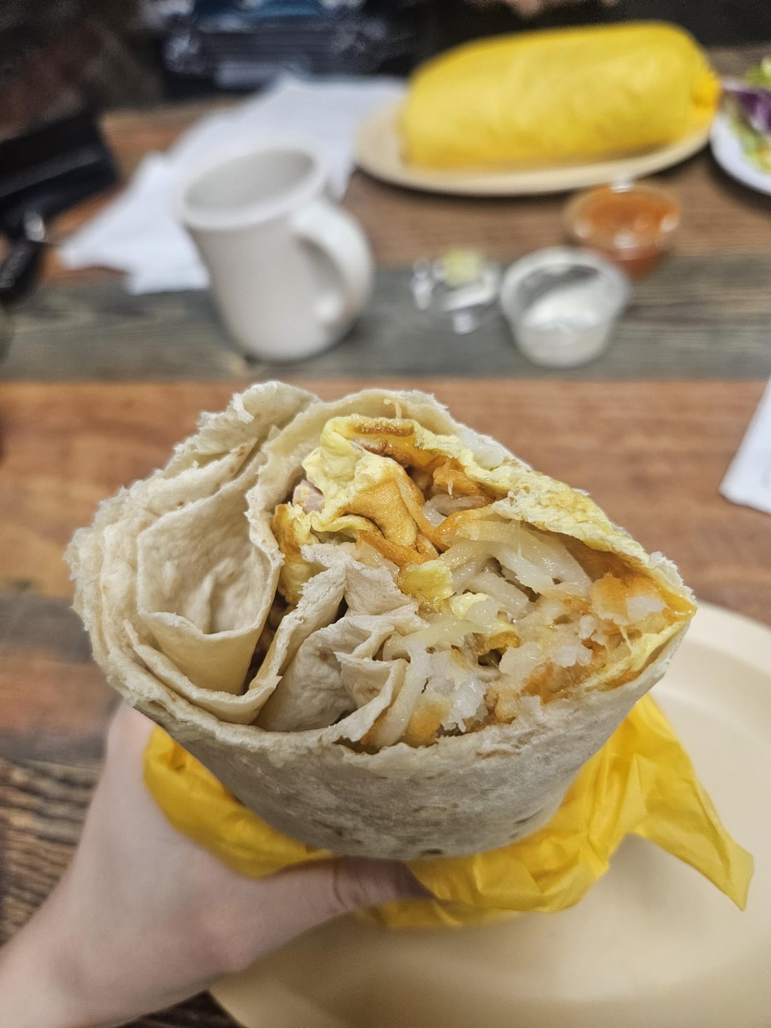 Went out with my family to try this restaurant close to home, it's a breakfast burrito filled with eggs, cheese, bacon, hash browns, ham, and I believe sausage as well. It was delicious, but I don't think I left many calories for the rest of my day 💀🙏