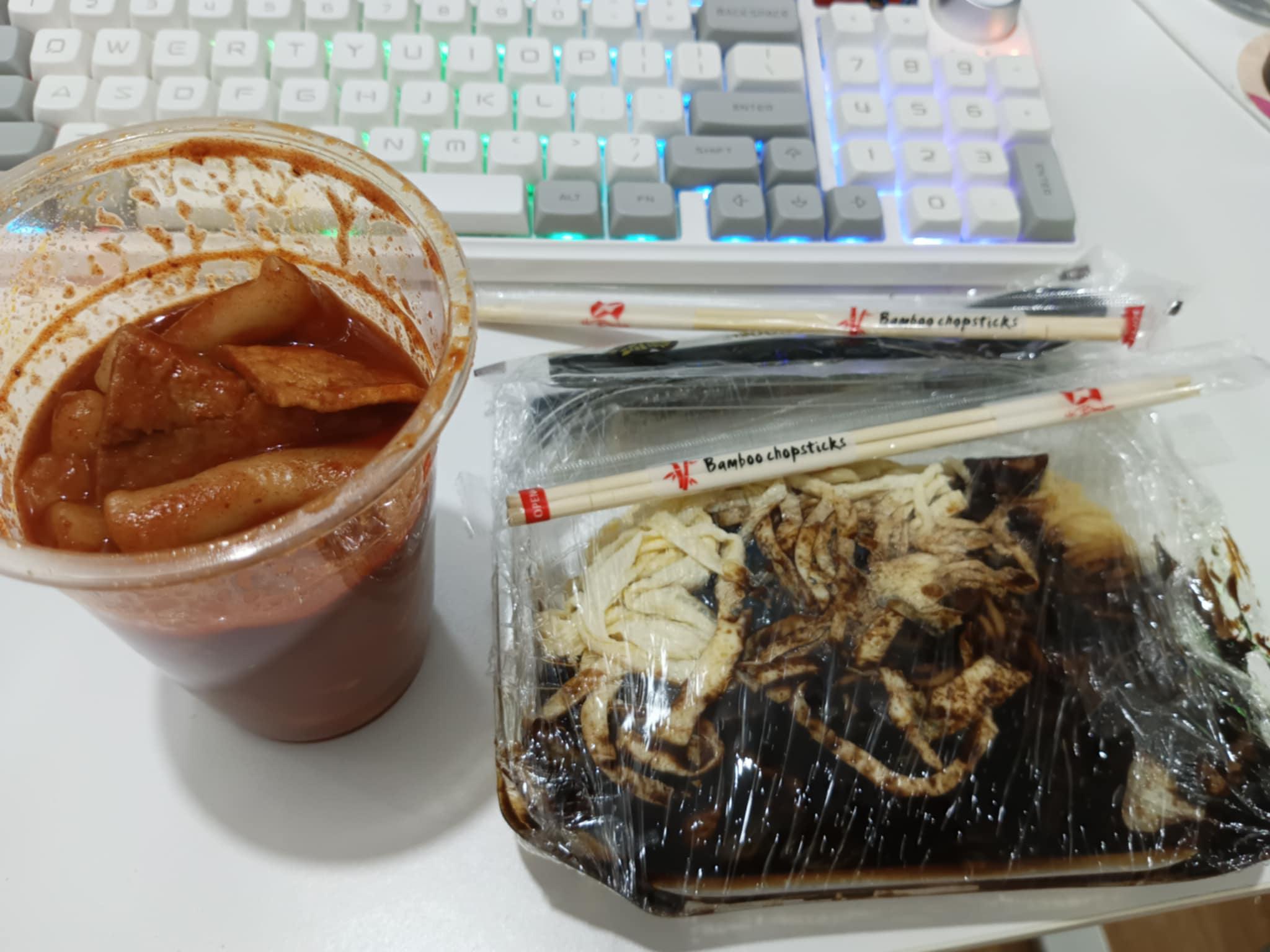 jjajangmyeon is like spaghetti with respect to how notoriously it splatters all over the place when you eat it lol this is why everyone is mentioning your desk/white keyboard