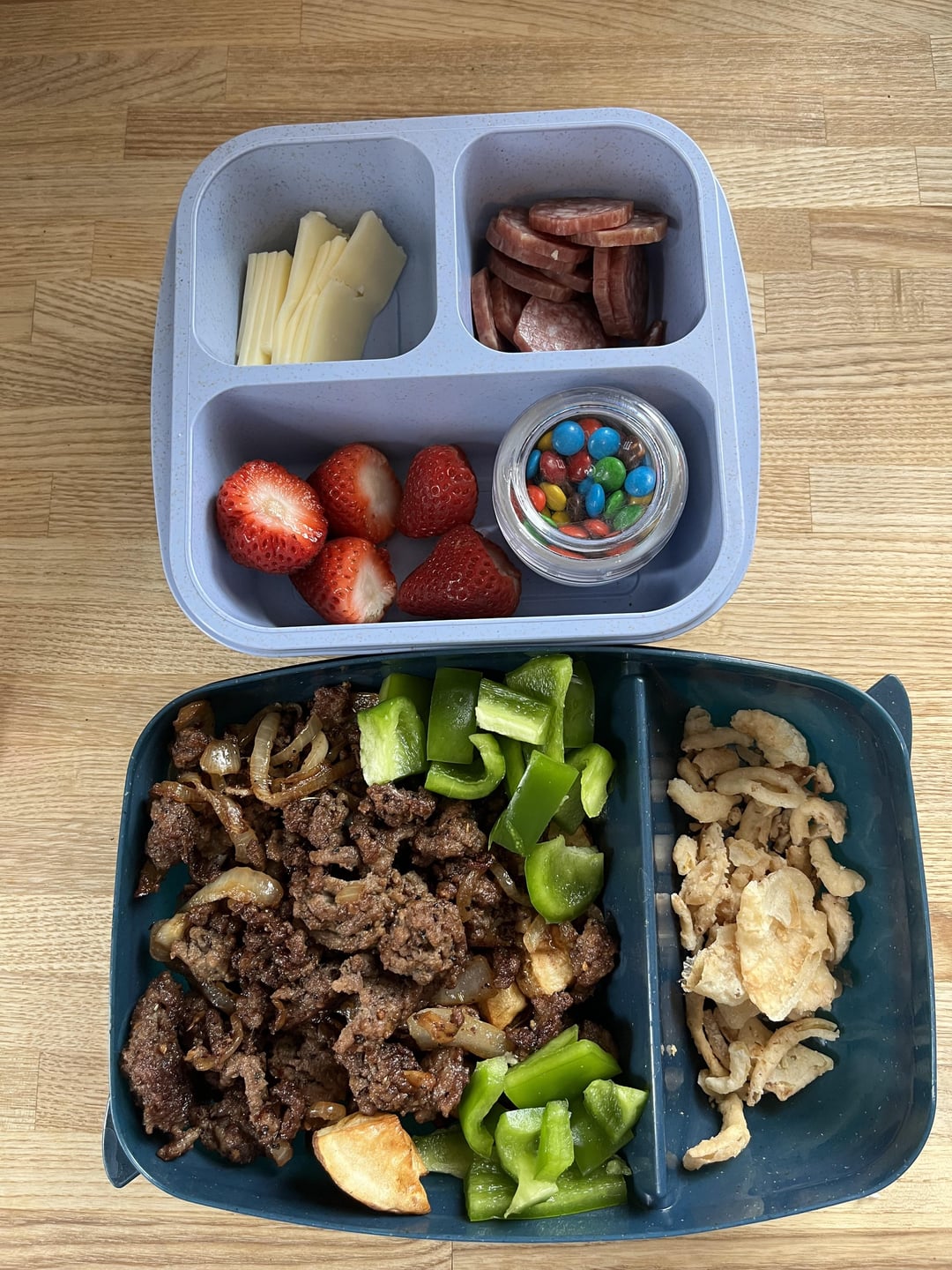 Cardio day for me is air fryer potato cubes, ground beef seasoned with burger spices, sautéed onions and bell pepper with a little topping of French fried onion (400 calories, 32g protein). Gym day for her is salami, cheese, strawberries and mini m&ms. She also has some pita crackers (not pictured since that can’t go in the fridge).