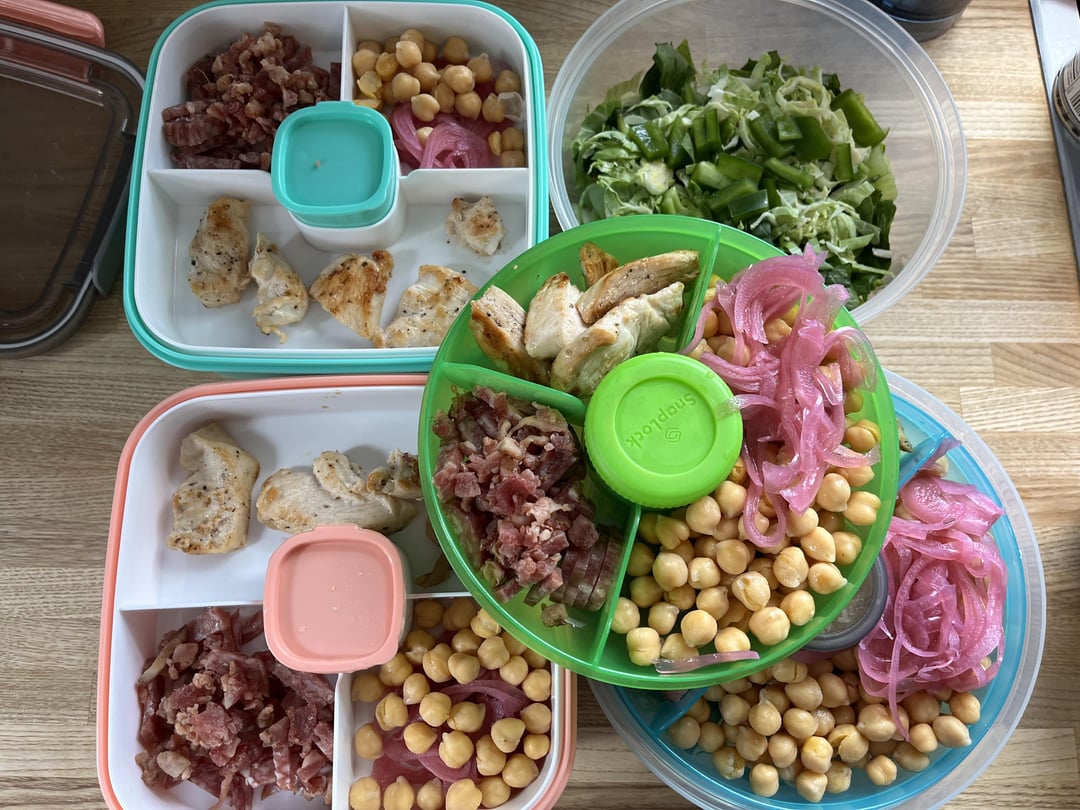 Salads are: salami, bacon bits, chicken breast, chickpeas, pickled onion, lettuce and spinach, with Italian dressing (320 calories, 30g protein).