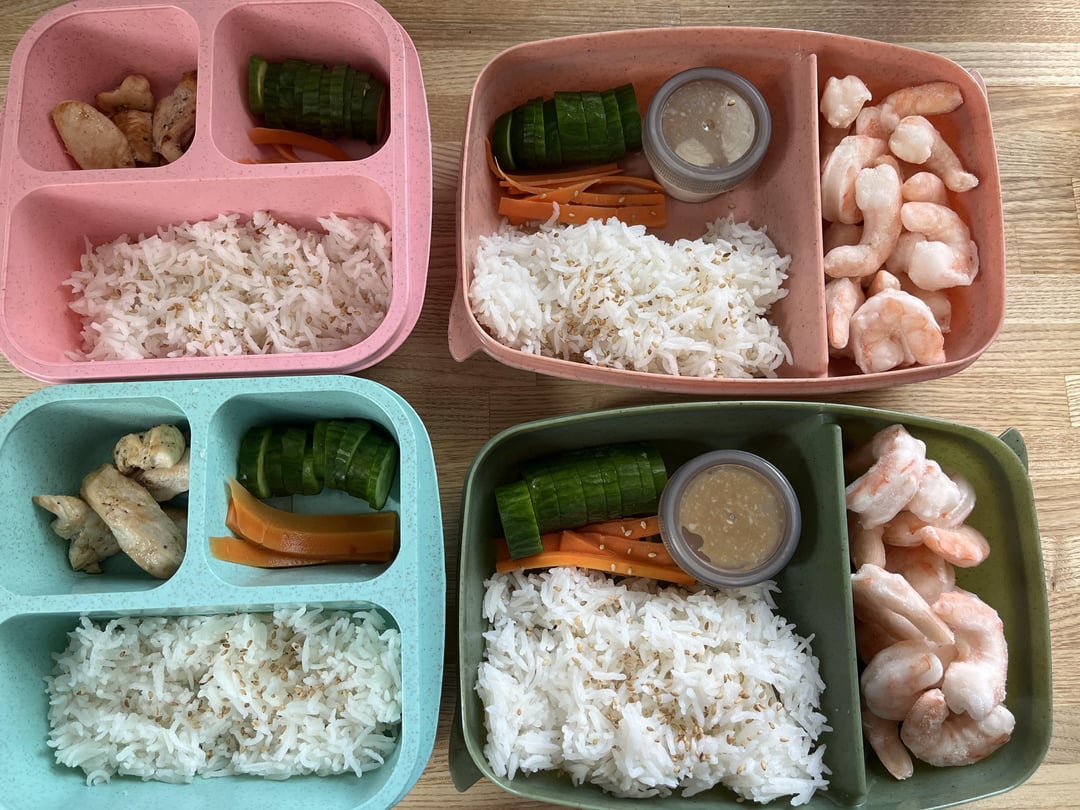Then it’s chicken breast and rice with cucumber and pickled carrot for her. I’ve got the shrimp. I did a Yum Yum sauce with light mayo as well (290 calories, 28g protein).