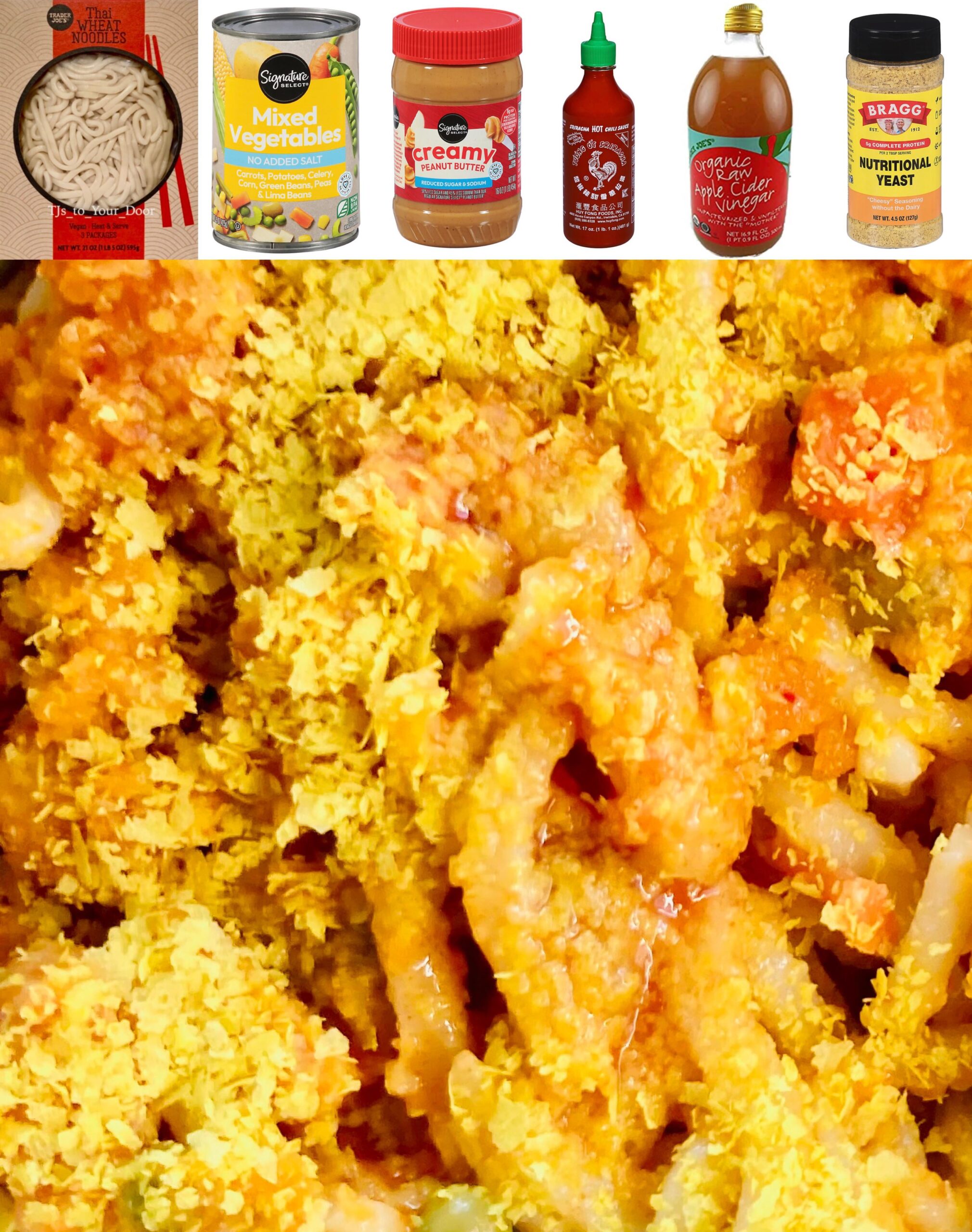 Pour the sauce over the heated noodles and veggies, toss, and finish with nutritional yeast