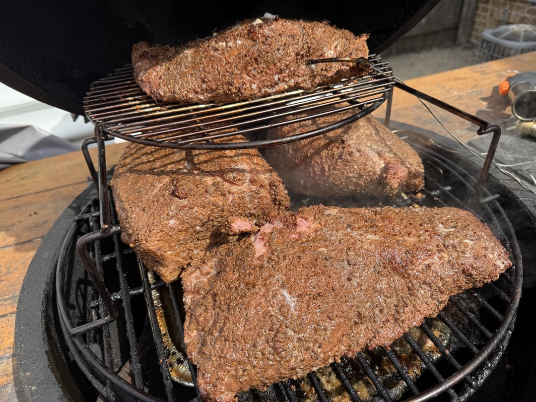 I smoked a prepared corned beef brisket a little over a week ago. Used the spice package along with freshly ground pepper as a rub. At 165 I put it in a pan with beef bone broth. I was in heaven for days afterward, it tasted so good. I hope yours went as well as mine.