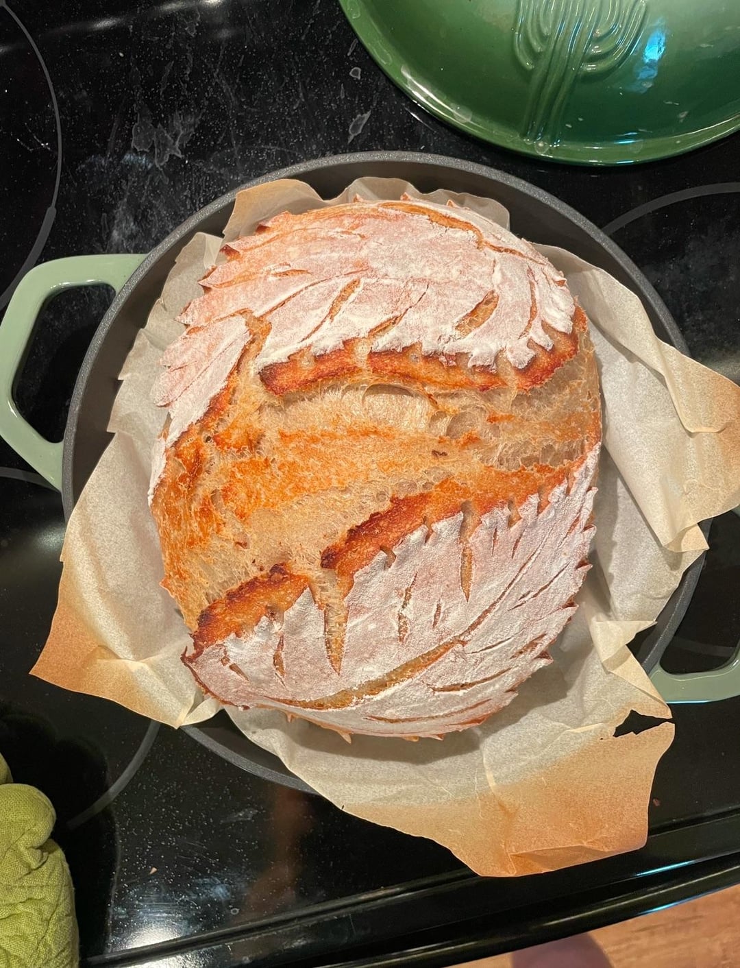 - Bake at 450F in preheated dutch oven for 25 min covered (two ice cubes added under parchment paper to create steam), and then another 10-15 minutes without the lid for ultimate crispiness