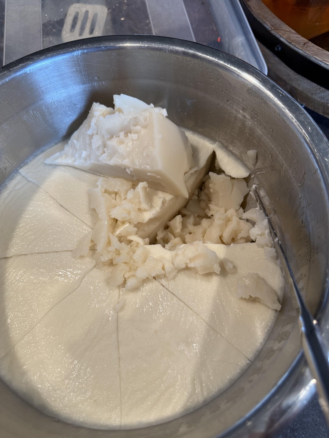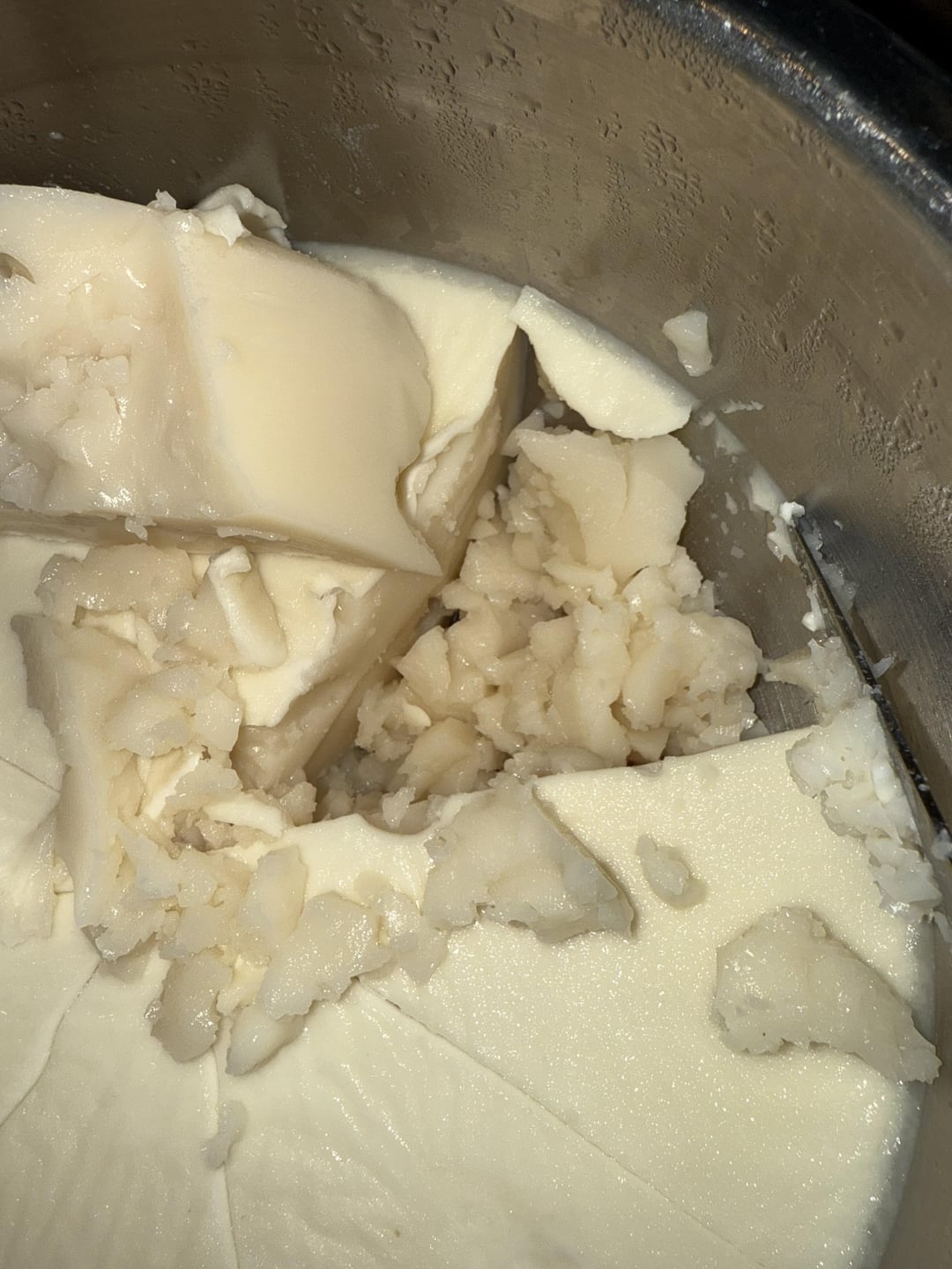 This is how it’s supposed to look after it’s cooled down. You’re good! The waxy fat settles on top, and the gelatinous fat is on the bottom. When you heat it up, you just need to make sure that the portion you add to the pot is even from top to bottom: like a slice of cake. As long as the ratio in your single serving is consistent with the rest you’re good to go