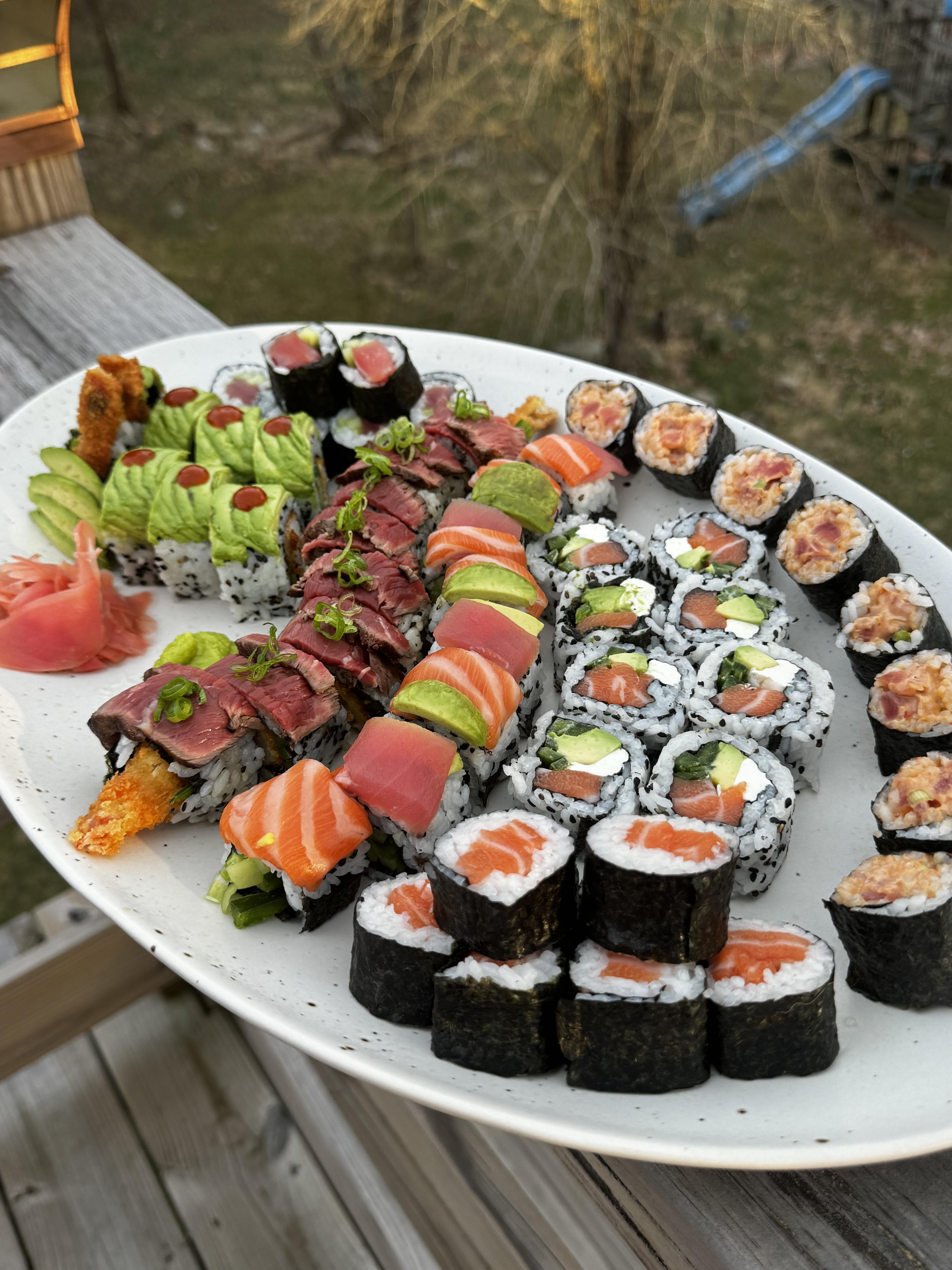 Edit: One thing I could say is that you could have the white rice roll on the right touching each other 2 at a time upright. You know what I mean? Just have them so close together like places do with some of their rolls. Might give you a bit more space to play with.