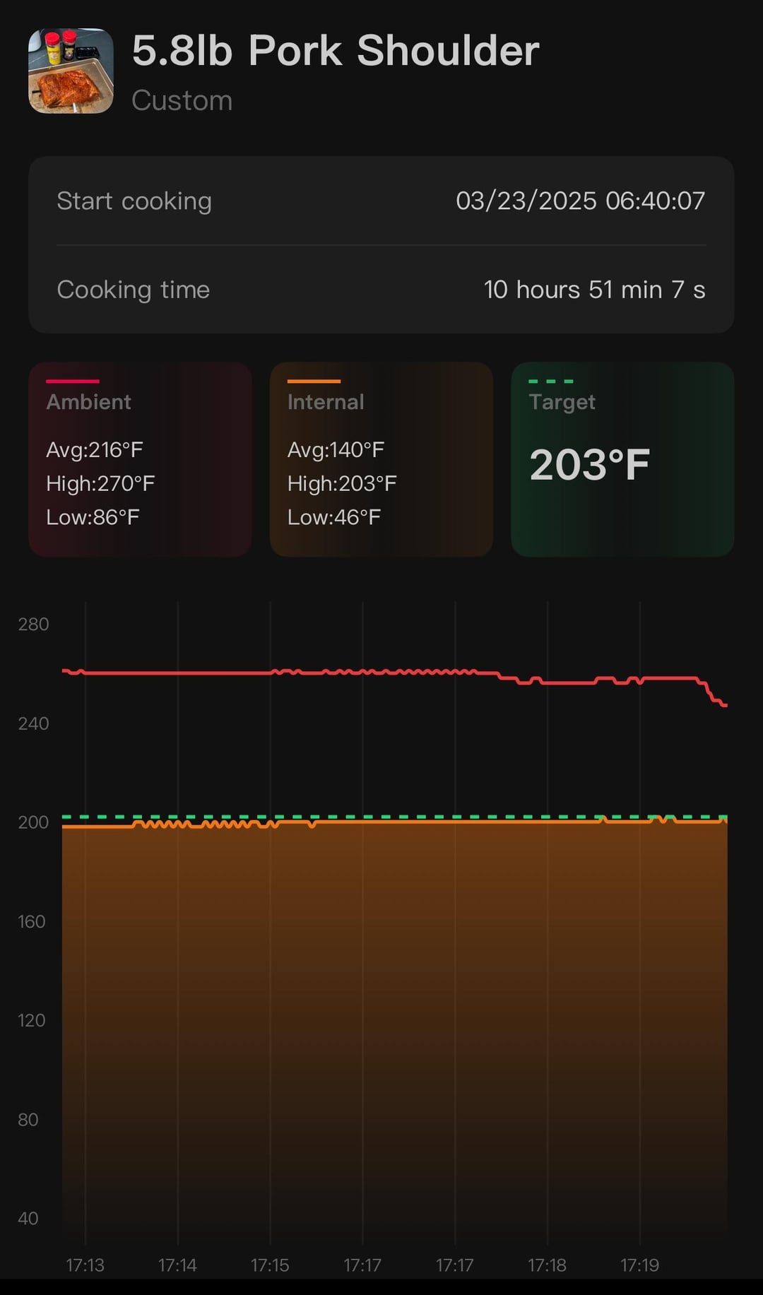 Don’t go by temp alone. Get an instant read thermometer and probe it every 30 minutes when your wireless shows 190. I’ve had some that are perfect at 190 and some that are perfect at 205. Probing should feel like soft butter. Just the slightest bit of resistance at the surface, but then barely at all beneath. Don’t worry about the temp reading at all. Just the consistency.