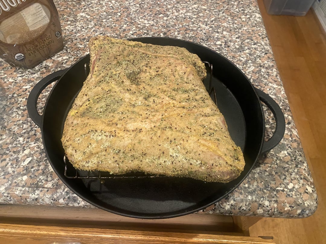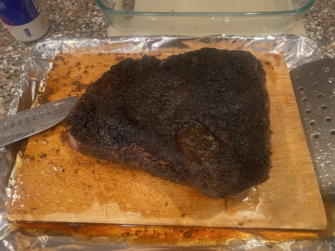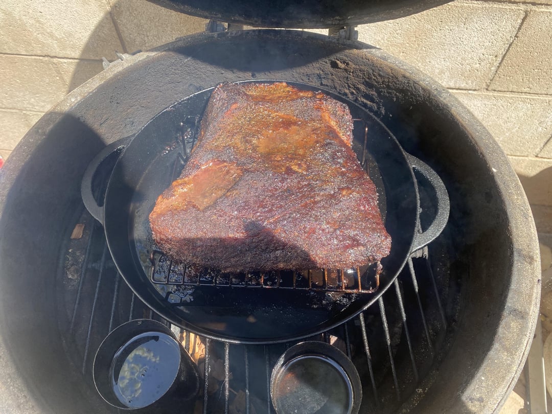 5.5 hours. It was a 5.9lb brisket flat. Mesquite lump charcoal with hickory chunks and chips in the big green egg.