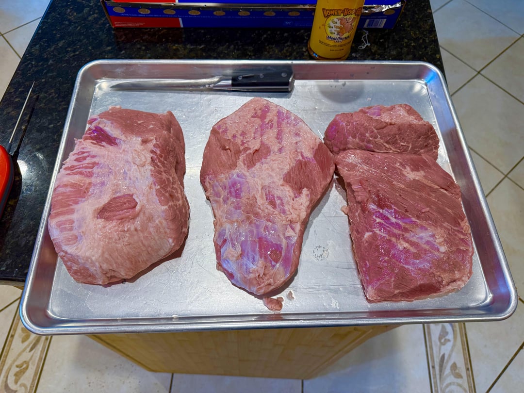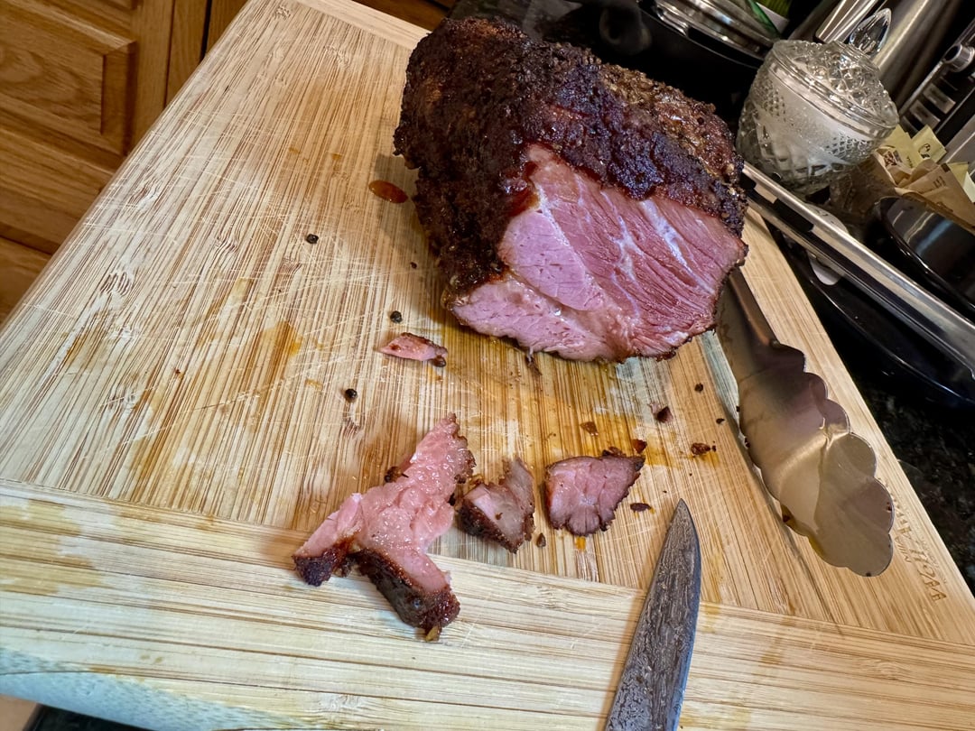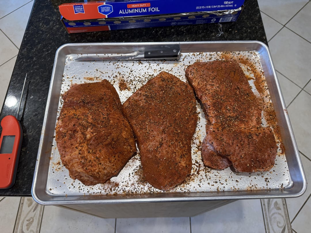 Left over corned beef turned into pastrami on my Traeger with hickory pellets. After an overnight water soak to remove the excess sodium, these got seasoned with coriander, pepper and paprika. 8 hours at 225 with super smoke and then wrapped in covered foil pan with a little bit of tallow and beef broth. Freaking tender and delicious.