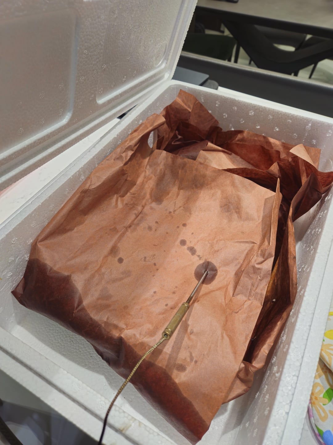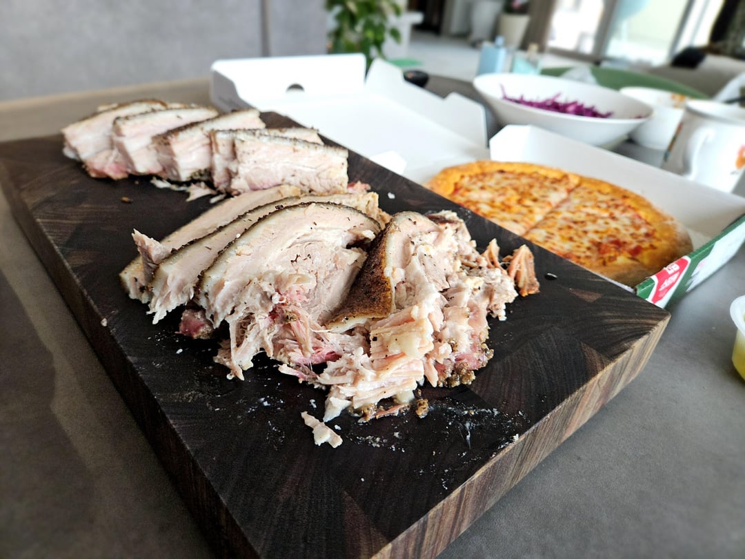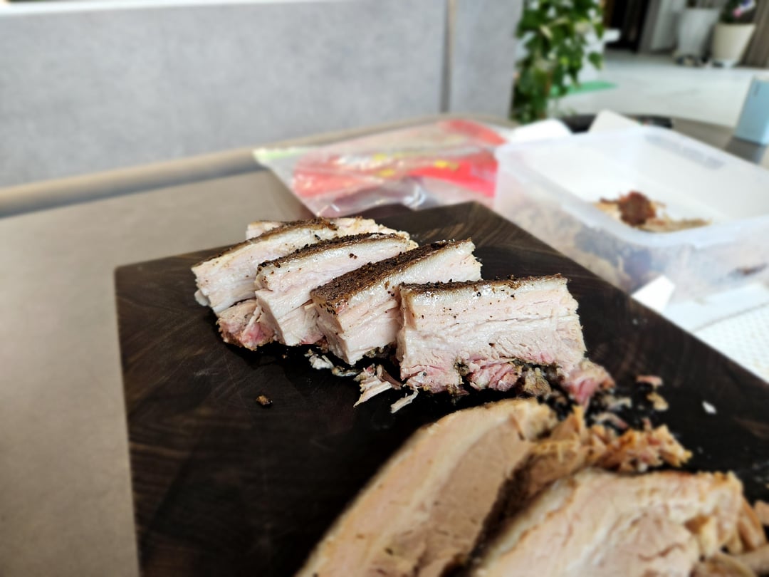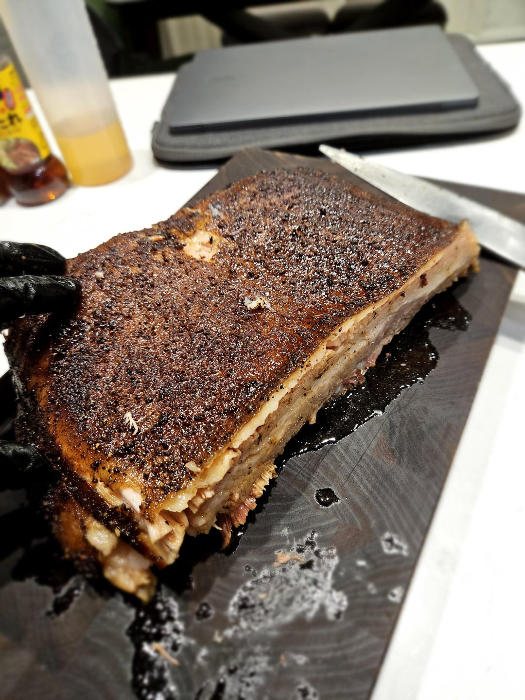 Aiming for some brisket-like results, I smoked it low and slow at 110C for about 14hrs. (including time I had to restart the charcoal because it unexpectedly rained… AND SNOWED)