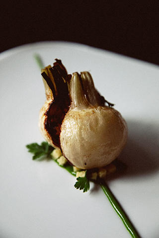 A dish where turnips are cooked at low temperature for four hours, finished with melted butter drizzled on top.