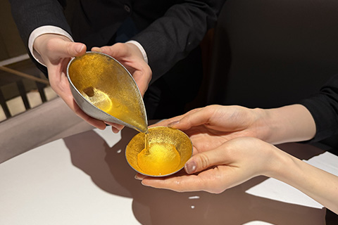 “At our restaurant, we often use not only butter but also whey1, which is derived from milk, in our cooking. That’s why we believe that the sake made using the kimoto brewing process2, which is crafted through the fermentation of lactic acid bacteria, pairs particularly well. The gentle acidity found in dairy products and whey harmonizes with the unique lactic acid flavors of the sake brewed in this way, making it an ideal match. The brewing method, which values tradition while utilizing the power of nature, aligns with the philosophy of our French cuisine. This is one of the reasons we highly recommend this sake.”
