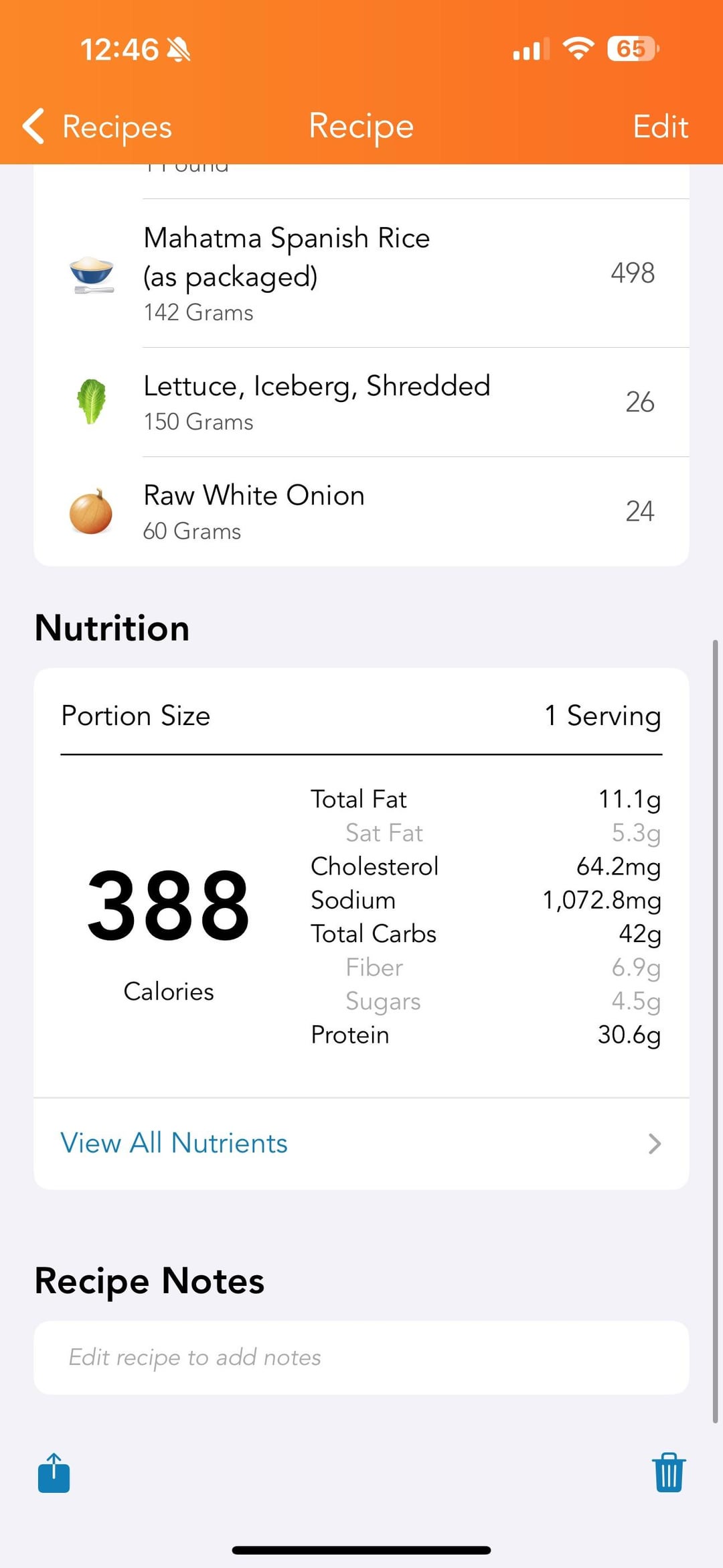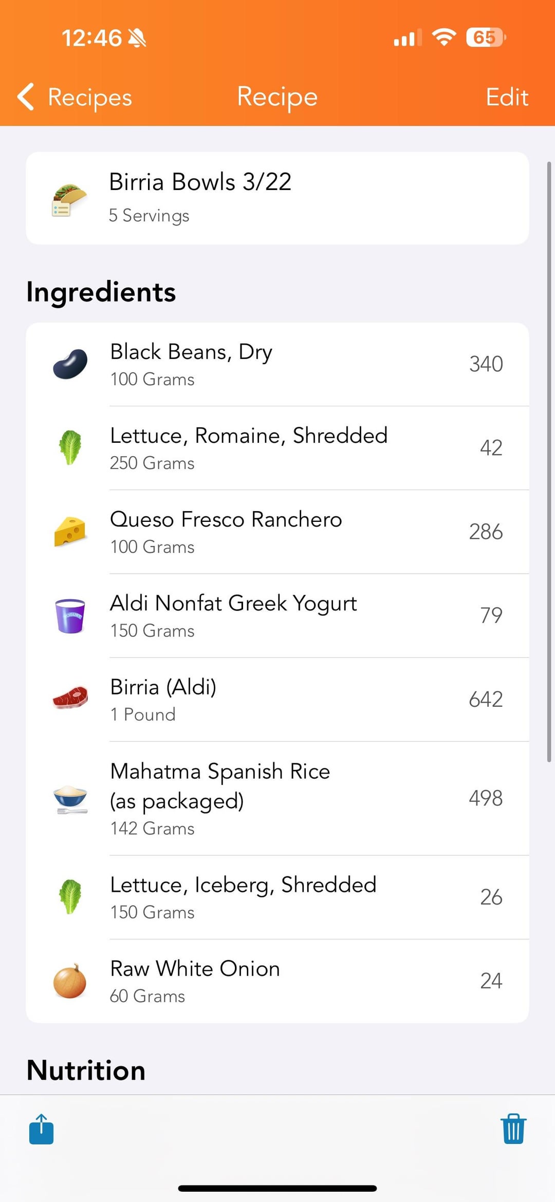 Ingredients in the screenshots, app is called LoseIt! Made the dressing myself with a Greek yogurt base, some water to thin it, cilantro, garlic and onion powder, and some green/jalapeño hot sauce.