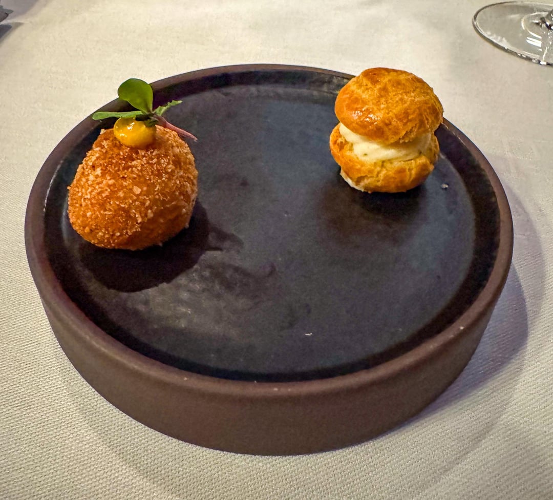 1) Amouse Bouche – Croquet with cauliflower, hazelnut, and curry mayo / Brioche with mascarpone and black truffle.