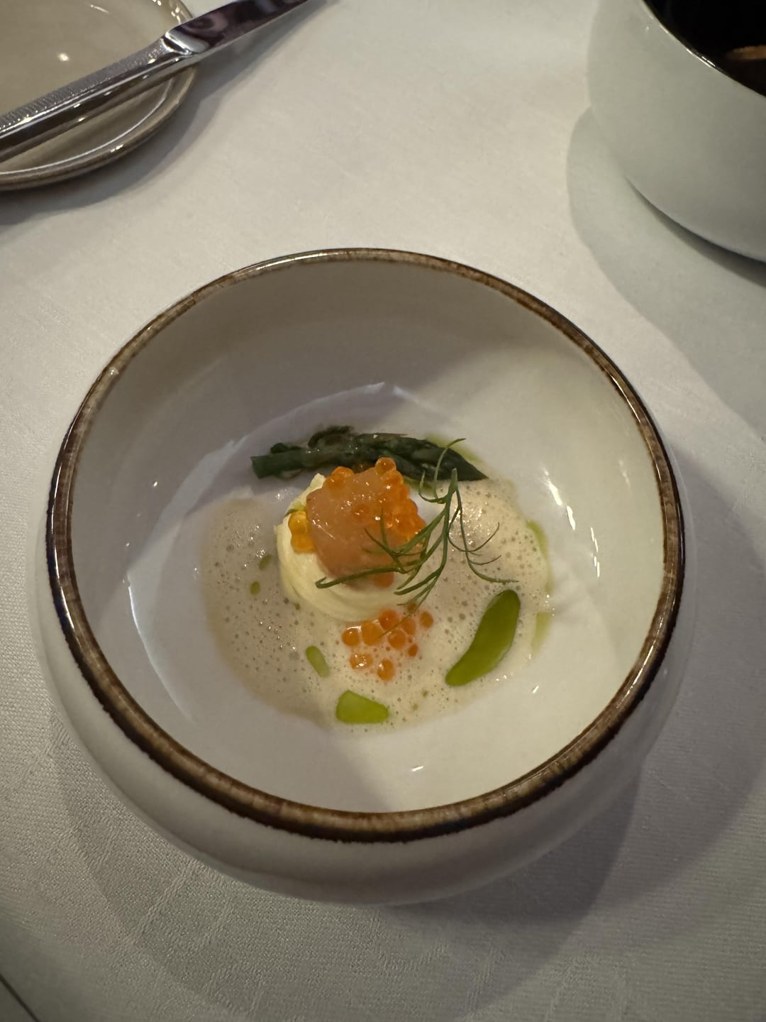 3) The bream dish was originally presented with the fish sitting on asparagus so that it was resting above the foam with caviar on top in view. The waiter knocked it over while serving, and went to go get a new one. The following dish was presented entirely differently. With the fish now below the foam and not visible any longer. Did they fix the same dish, or choose to present it differently due to serving issues.