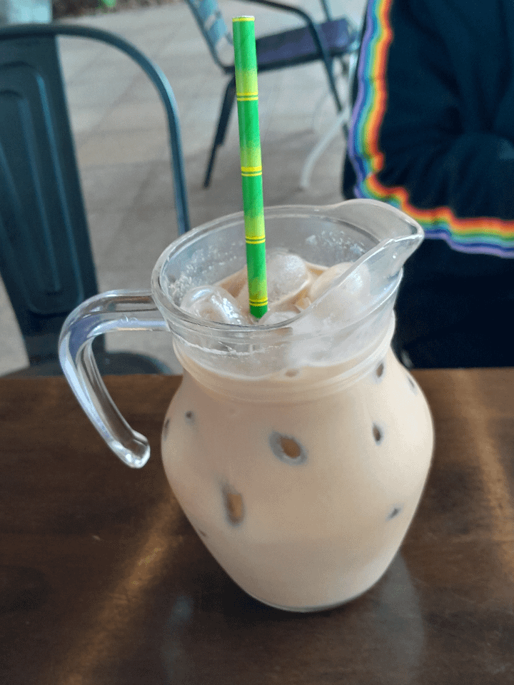 Out with friends and this popped out for iced coffee. Tried to convince her to use the spout. Didn't work. 😄