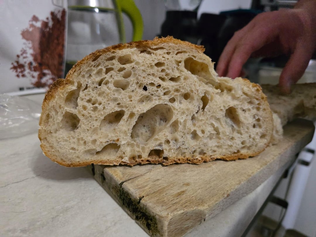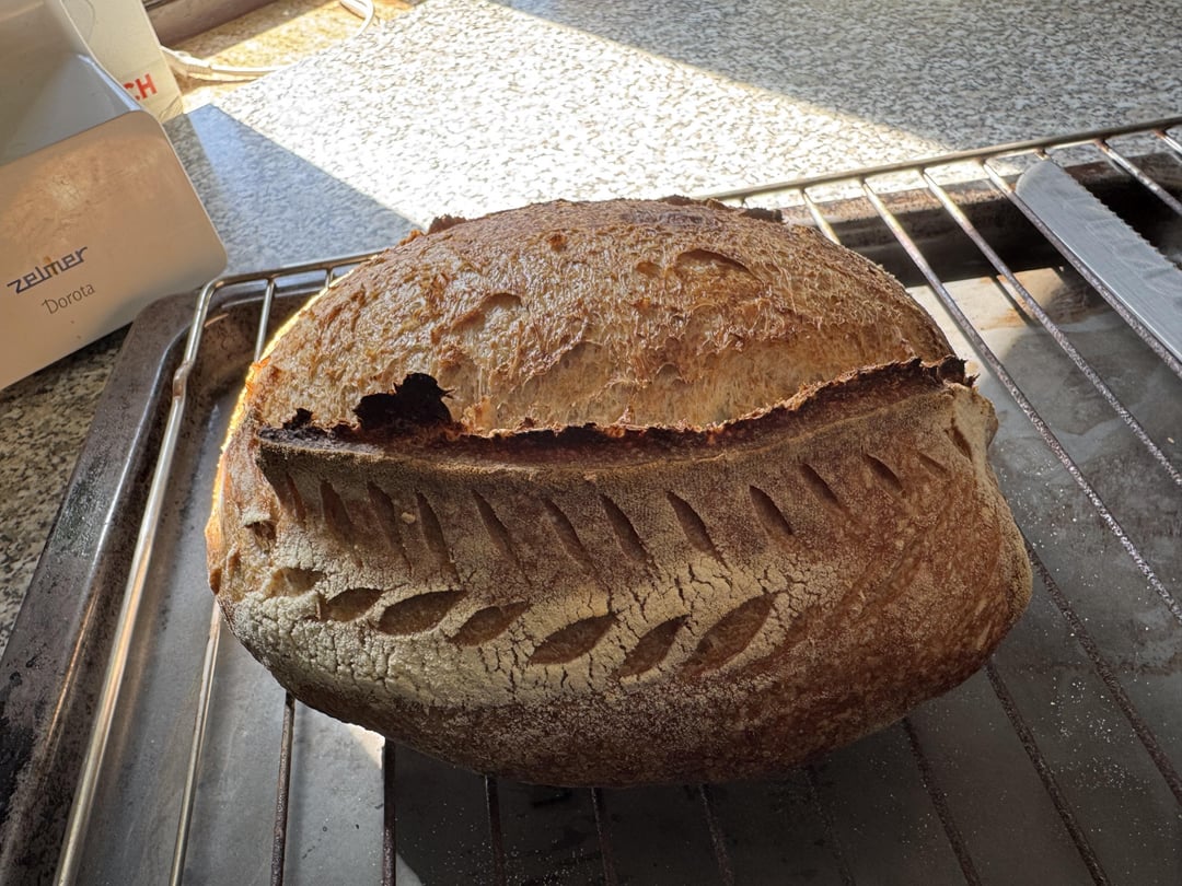 75% hydration, 500 grams flour 14% protein (mix of white and whole) , 100 grams starter
