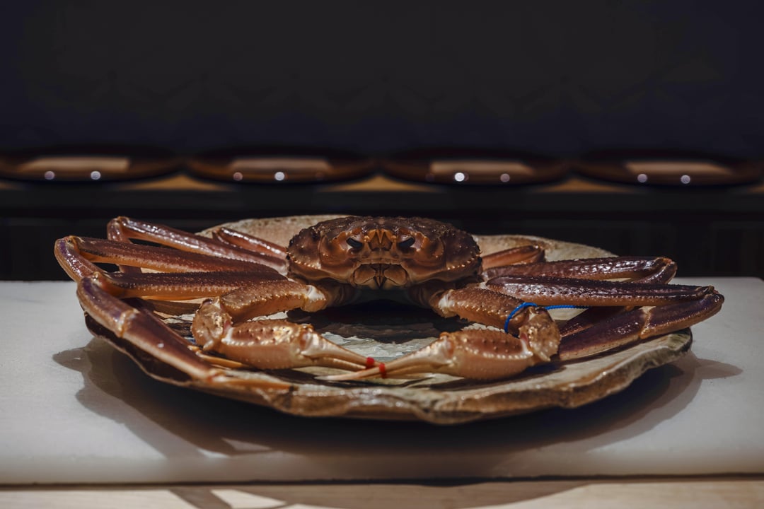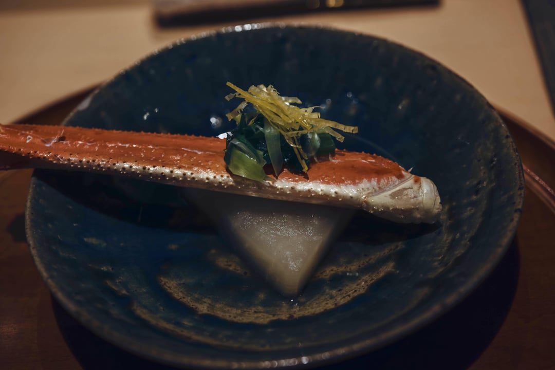 Echizen Snow crab, yodo daikon, kujo negi, yuzu peel. The crab is charcoal grilled, giving it a smoky aroma. The meat is very sweet and cooked just eight