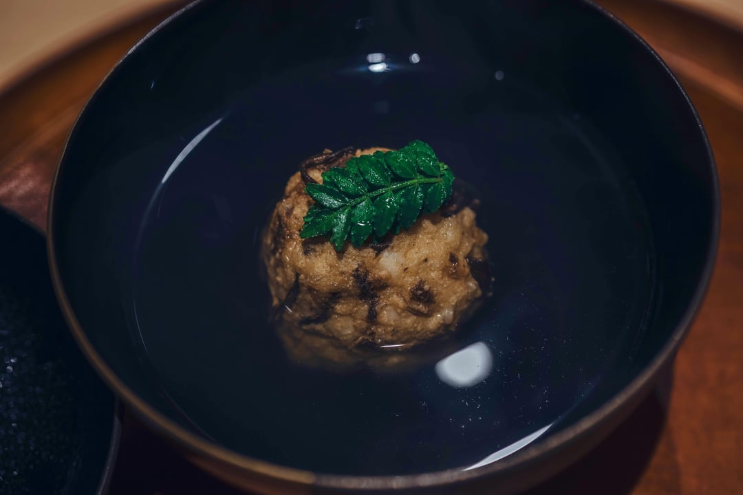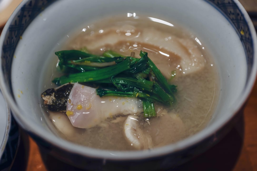 Suppon hirousu soup: hirousu is a dish made of tofu, mushroom, ginkgo nut, carrots and other ingredients shaped into a meatball and deep fried. The outside is crispy and inside is soft and tender. Mild in taste with a bit of umami, very enjoyable.