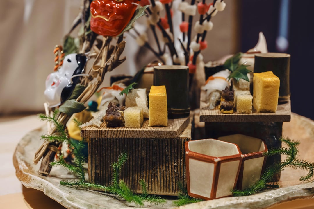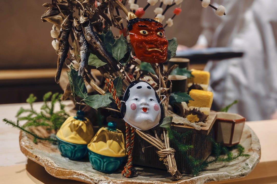 Setsubun Hassun: kaarage fuugu (additional). Hiragi (holly plant), iwashi, yuzu soybeans, yuzu, kanpyo (dried gourd) and wasabi roll, wakasagi (smelt), kinko, shinoda maki(deep fried tofu) and egg dumpling, fried, namako (sea cucumber), ika fried mizuna (mustard green) and nuta dressing, aka hagi