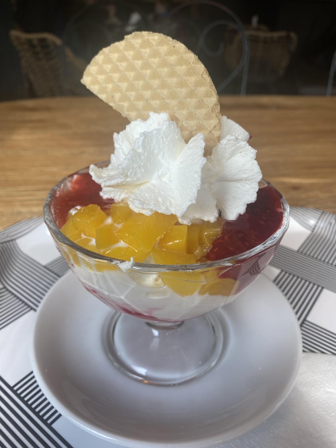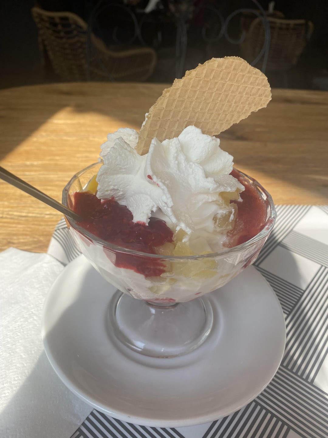 this is just cream flavoured ice cream, with whipped cream on top (wasn’t sugary at all, more tasteless than anything, not sure if that’s beneficial to point out but oh well!), some sliced pineapple, sliced peach, raspberry + strawberry mashed into a purée (i think that’s what its called). 💗