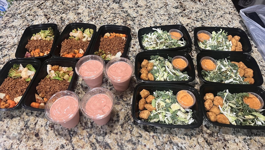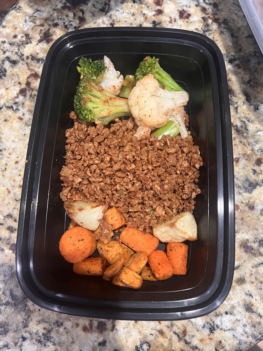 Dinner: vegan ground beef, taco seasoning, steamed broccoli and cauliflower, carrots/sweet potatoes/red potatoes