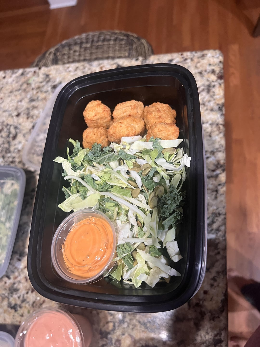 Lunch: kale salad (broccoli, green cabbage, kale, brussel sprouts, pumpkin seeds), light thousand islands dressing, chik’n (vegan) nuggets
