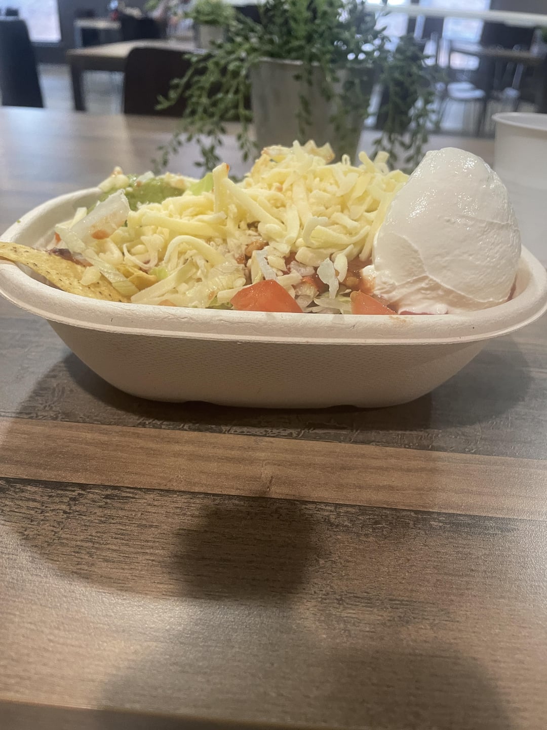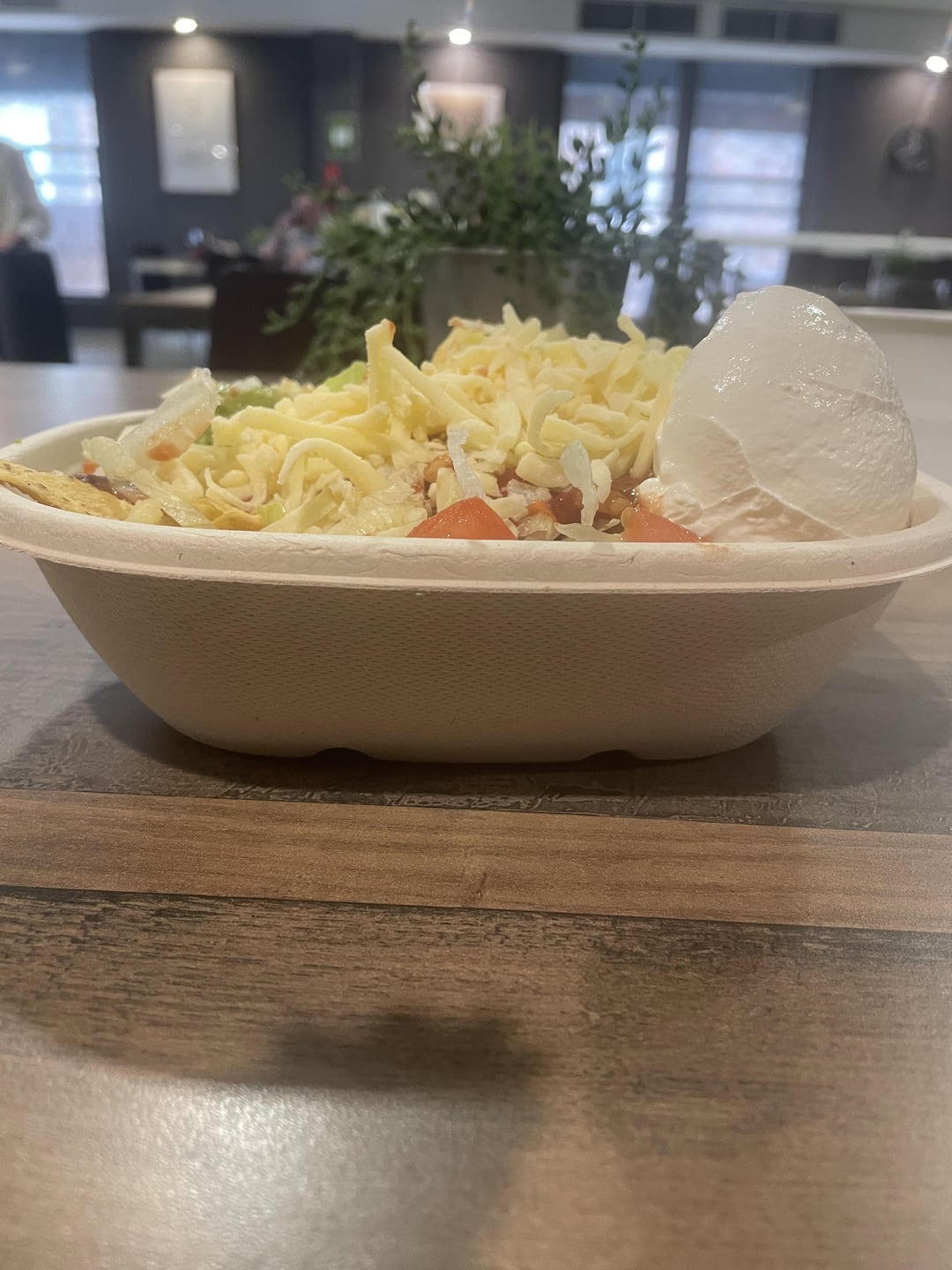 Vegetarian nachos with lettuce, guacamole, sour cream, salsa, and tomato’s