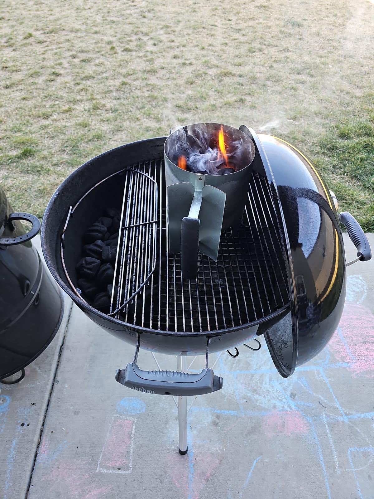 I take the grill off and rest the starter chimney on the ash grill inside.