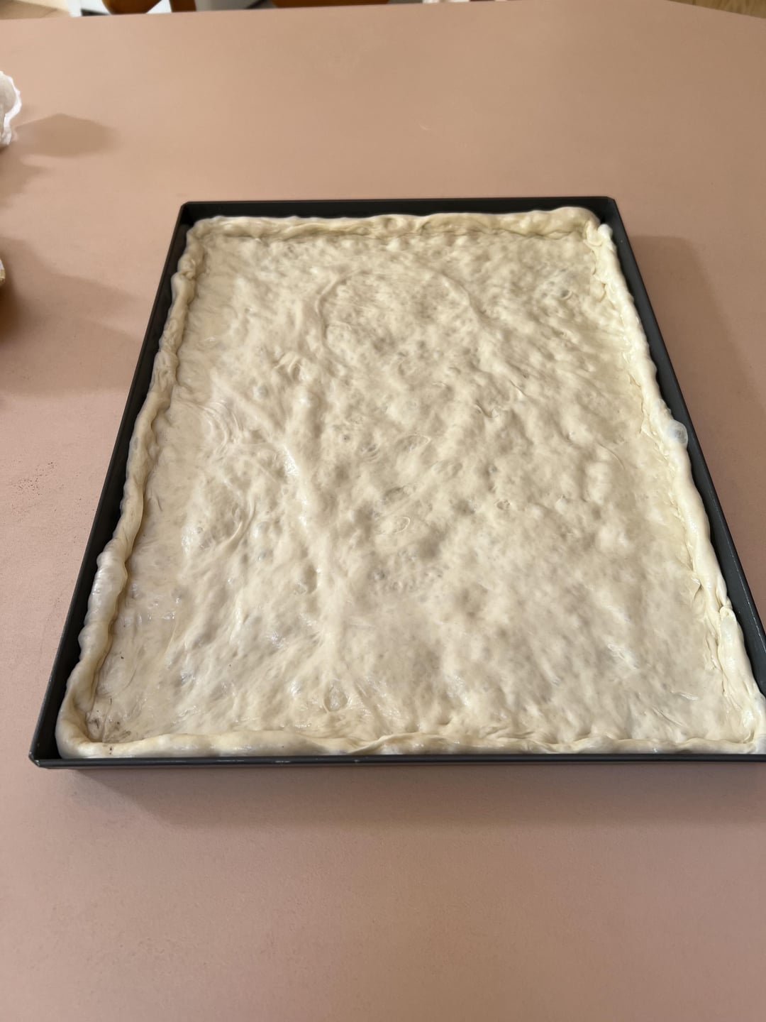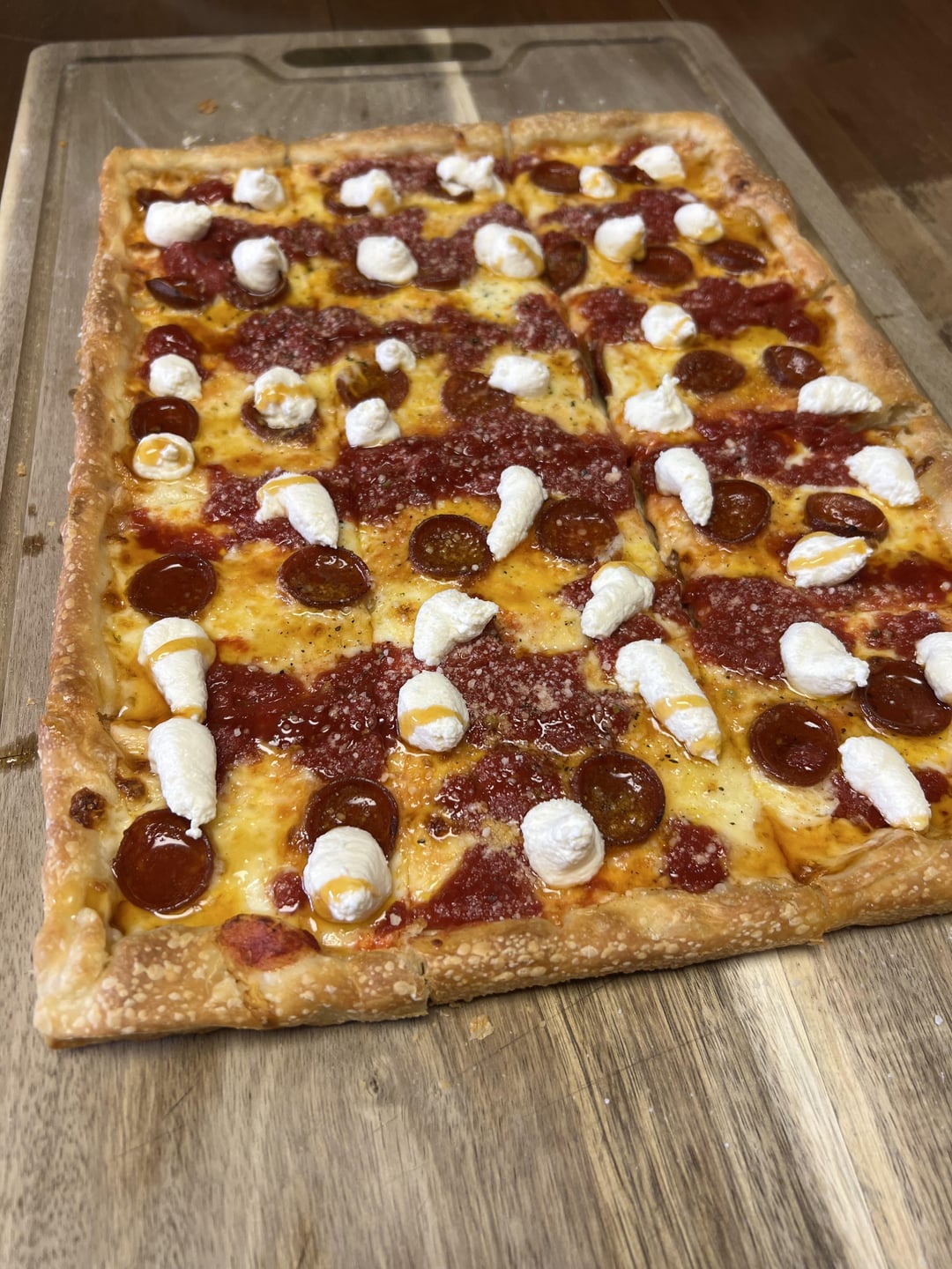 The best pan I’ve ever found for Detroit style crispy crust is disposable aluminum half-pans. And lots of olive oil.