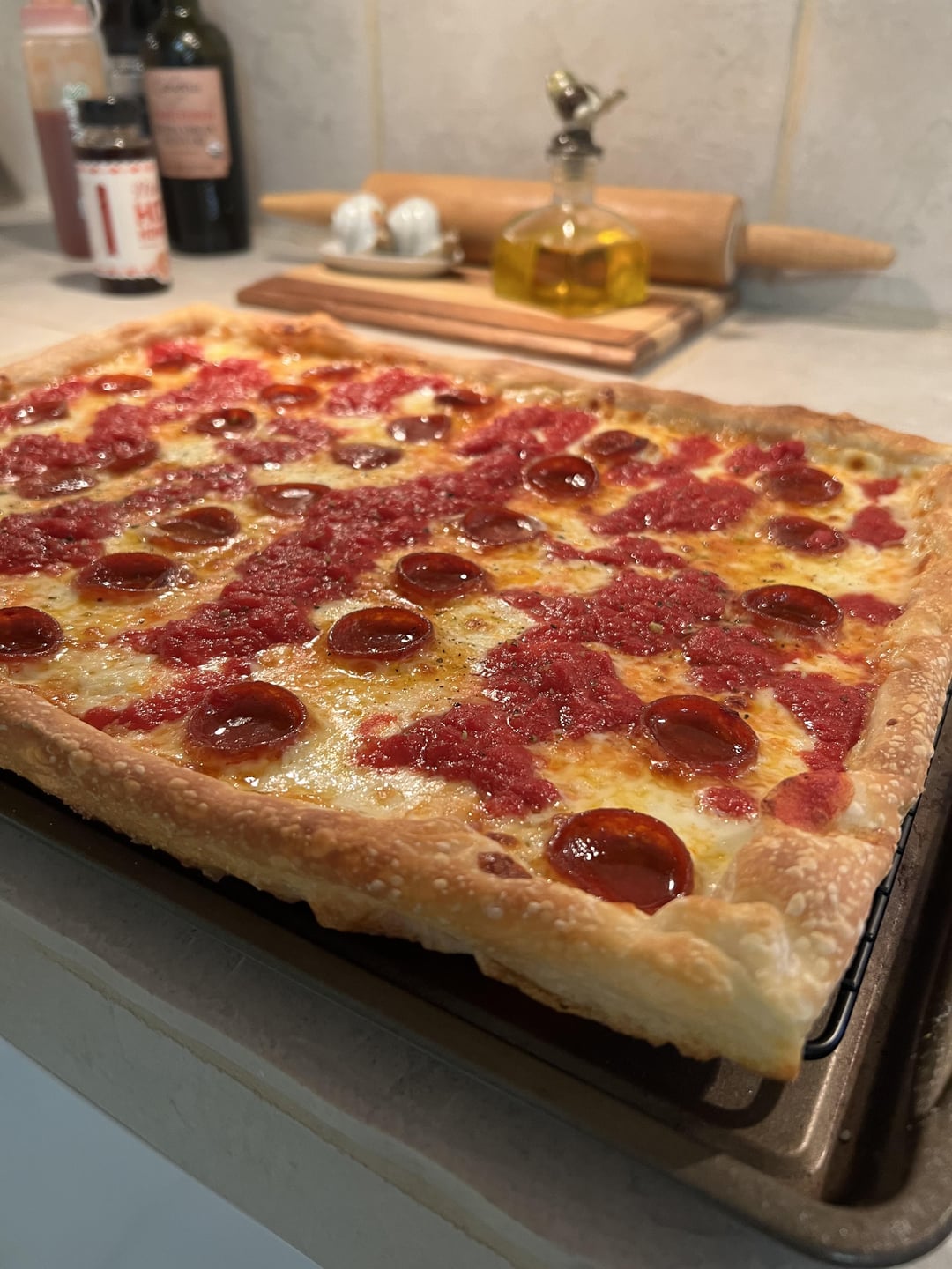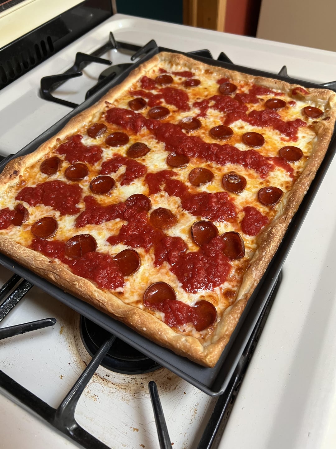 cmoon761 7 months ago The best pan I’ve ever found for Detroit style crispy crust is disposable aluminum half-pans. And lots of olive oil.