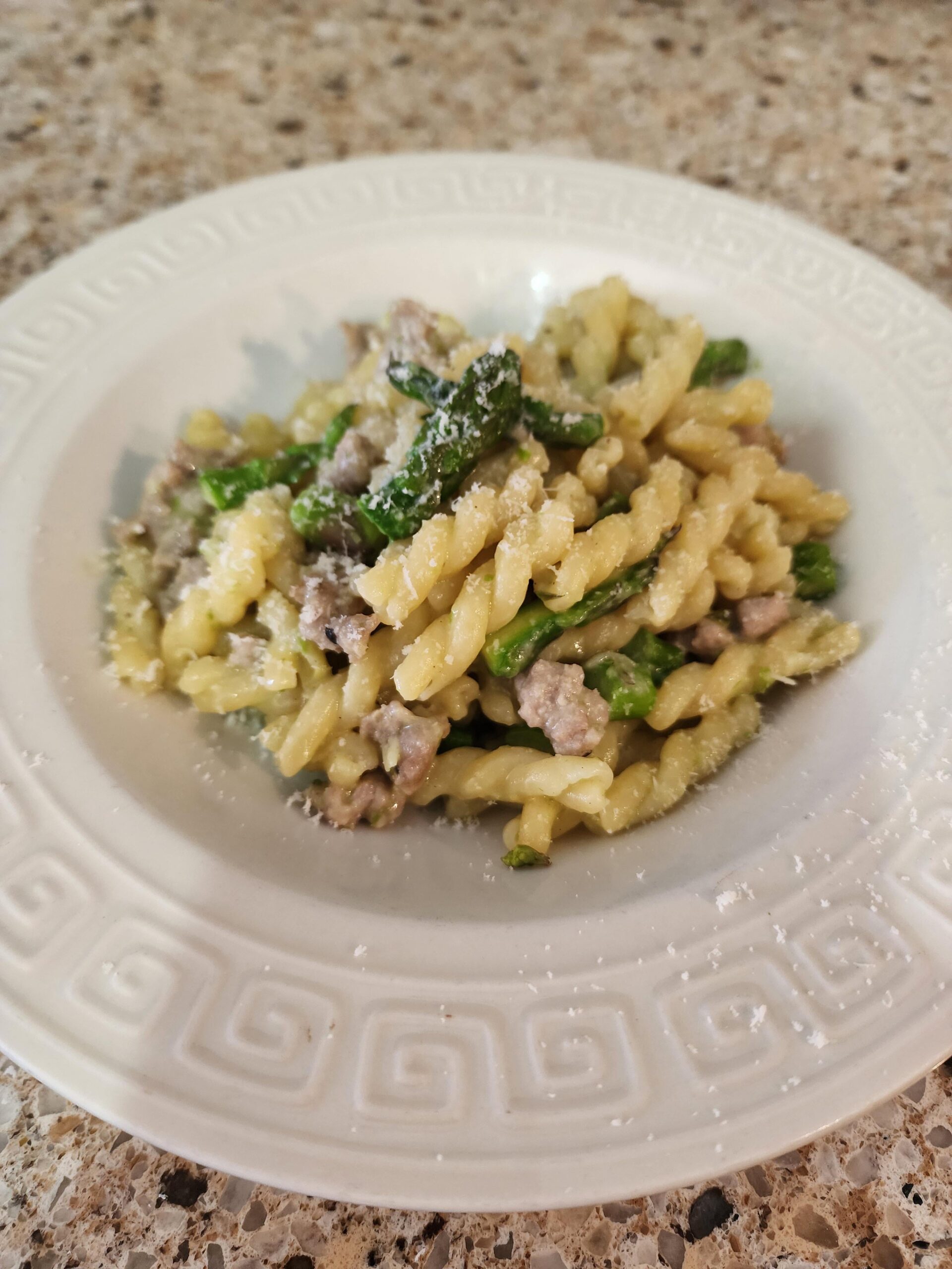 Sauteed, and later removed, sausage in a stainless skillet. In the same pan, I cooked down some asparagus in a leek, garlic and white wine base. Pureed a portion of those contents with gorgonzola to make a gorgonzola-asparagus cream. Topped with pecorino.