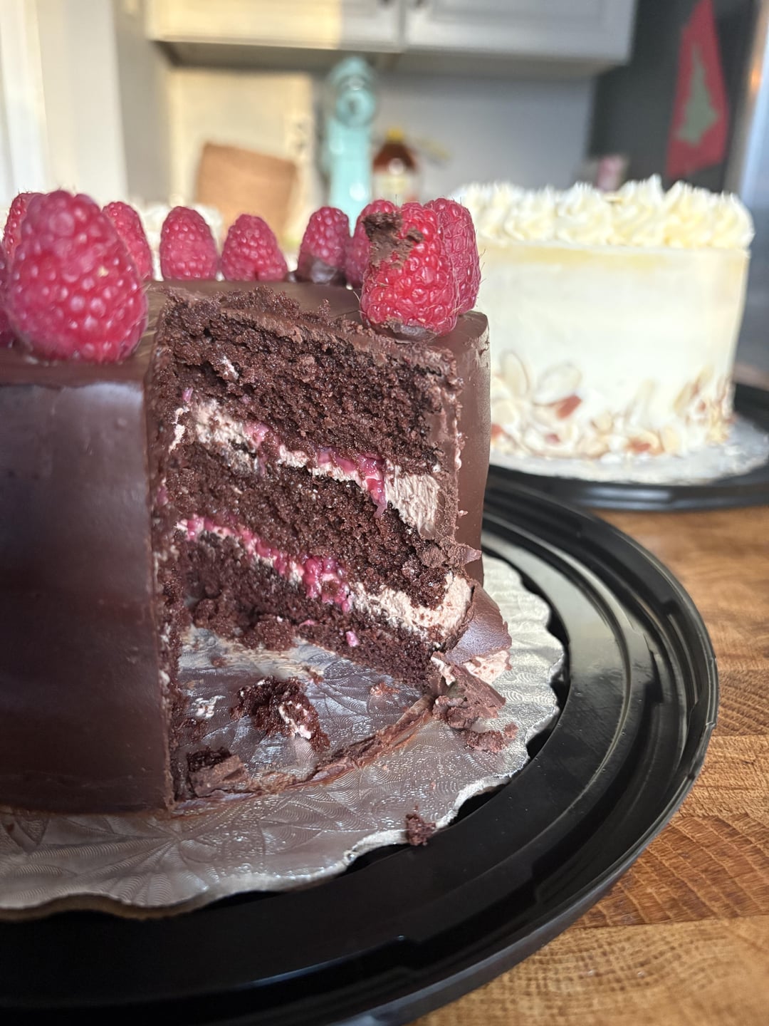Left: Chocolate sponge with a chocolate mascarpone mousse and homemade raspberry jam filling, chocolate ganache.