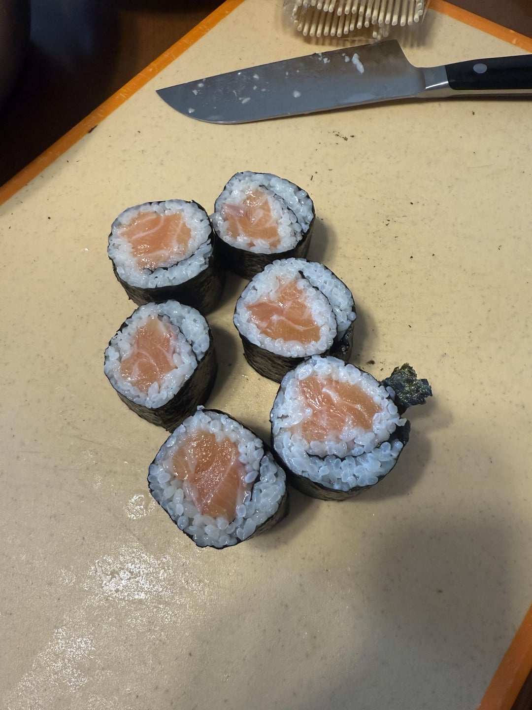 Very nice. You can see the over wrap of rice. More learning and experience will rapidly end that, making for an even tastier maki. I’m certain you enjoyed eating your creation. Nicely done. Thanks for sharing your work with us.