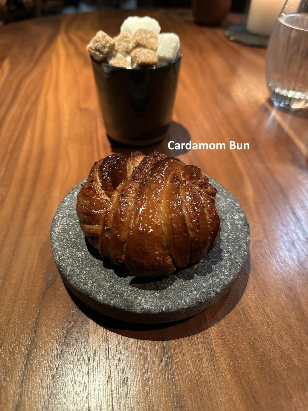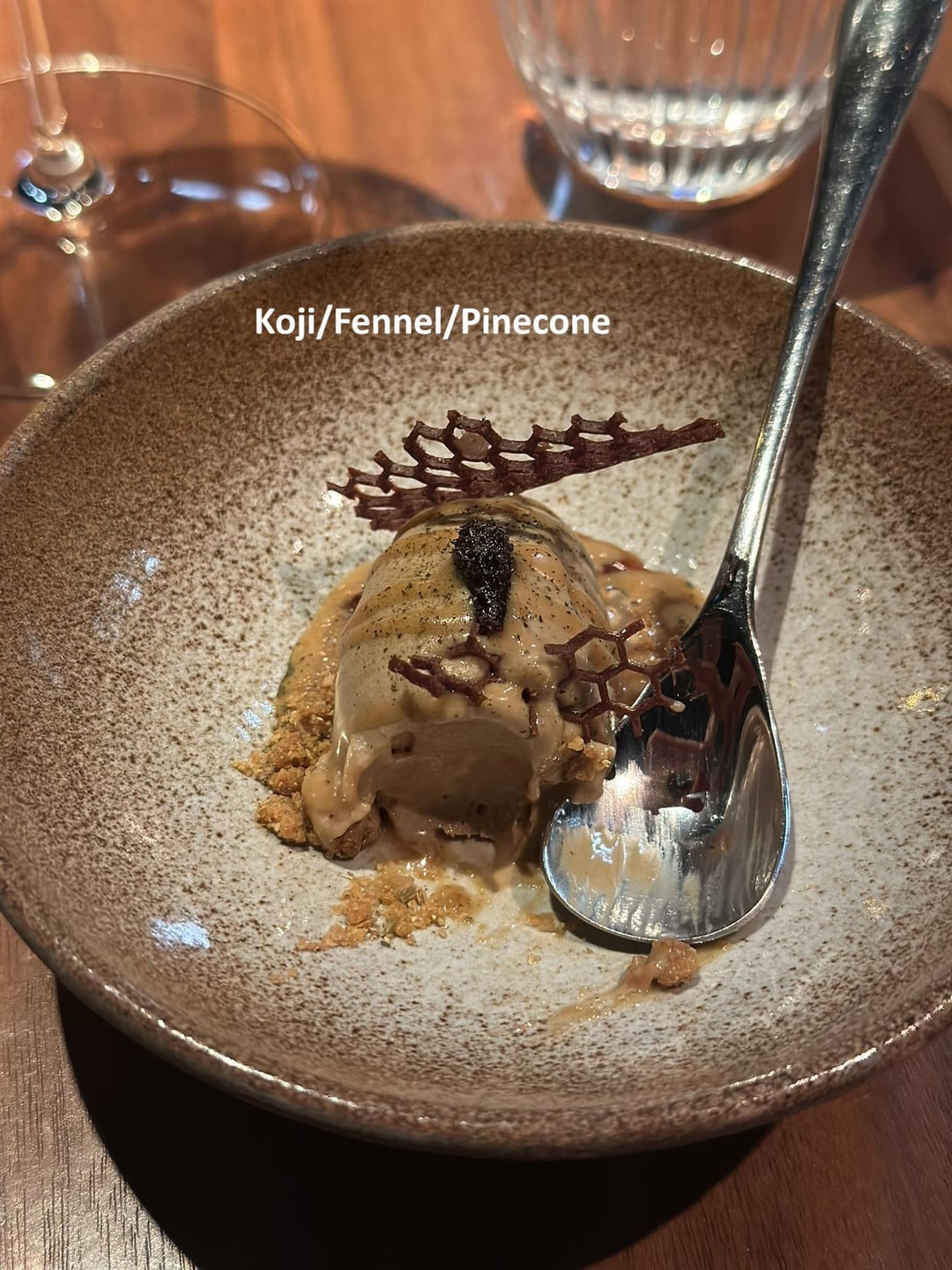 7) Desserts – two massively strong desserts. The first, a citrus flavor bomb to cleanse the palate right after the hearty reindeer main. Great textures in this dish with a strong kick of acid, that many might not appreciate but one that I really enjoyed. The main dessert, their signature, features a koji ice cream with crispy elements around it, one of them being a tuille made from onion if I recall correctly. This was an incredible dessert. The texture of the ice cream was absolutely perfect with flavors that are delicately sweet but savory at the same time from the koji. I loved the combination of the ice cream with the onion in the tuille and slight spice/herbaceous from the use of fennel. Also want to shout out the freshly prepared cardamom bun at the end. Crisp, soft, warm and slightly spiced perfection to conclude the meal.