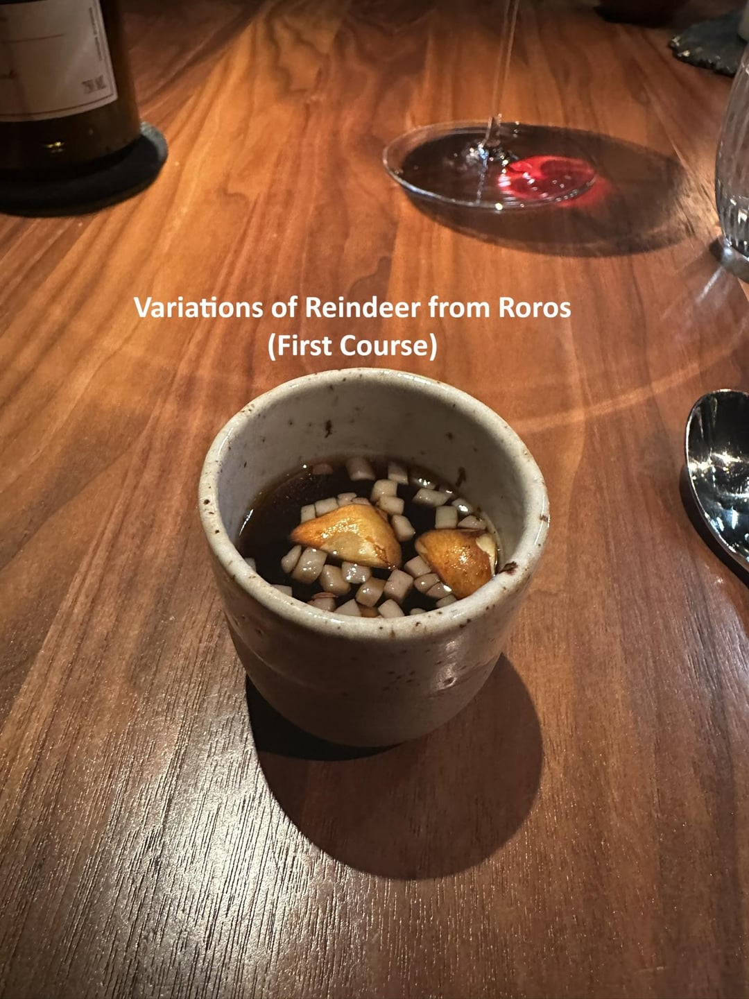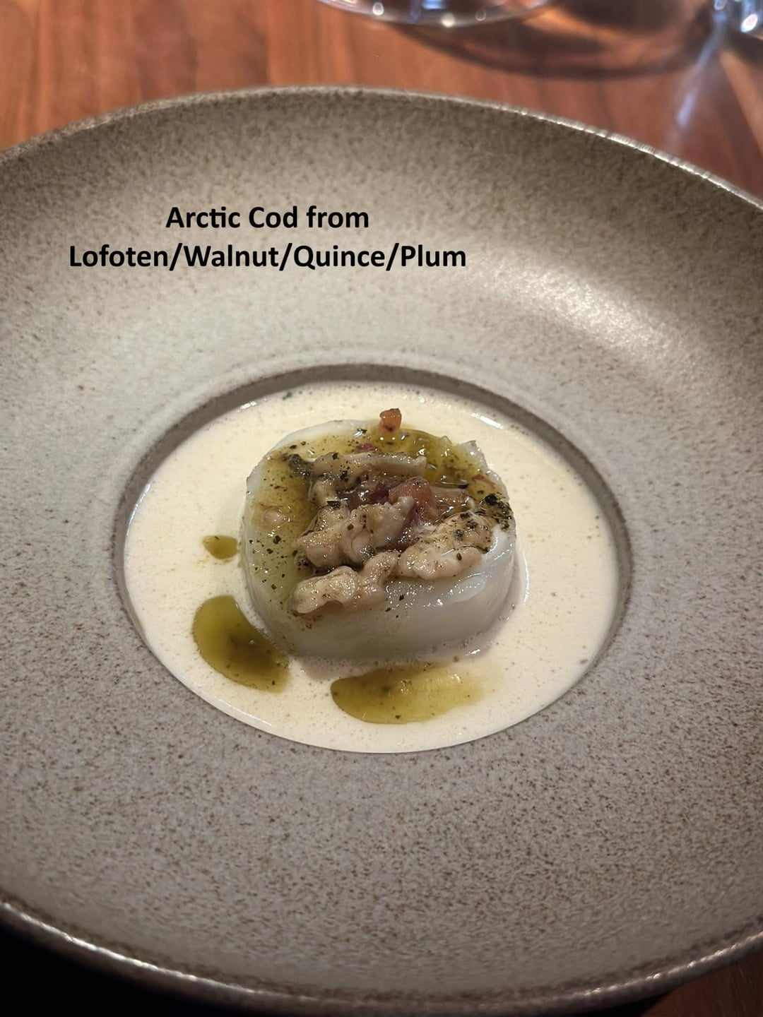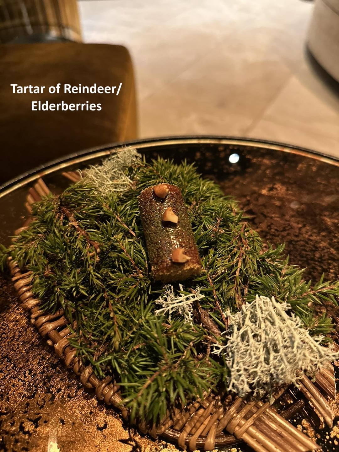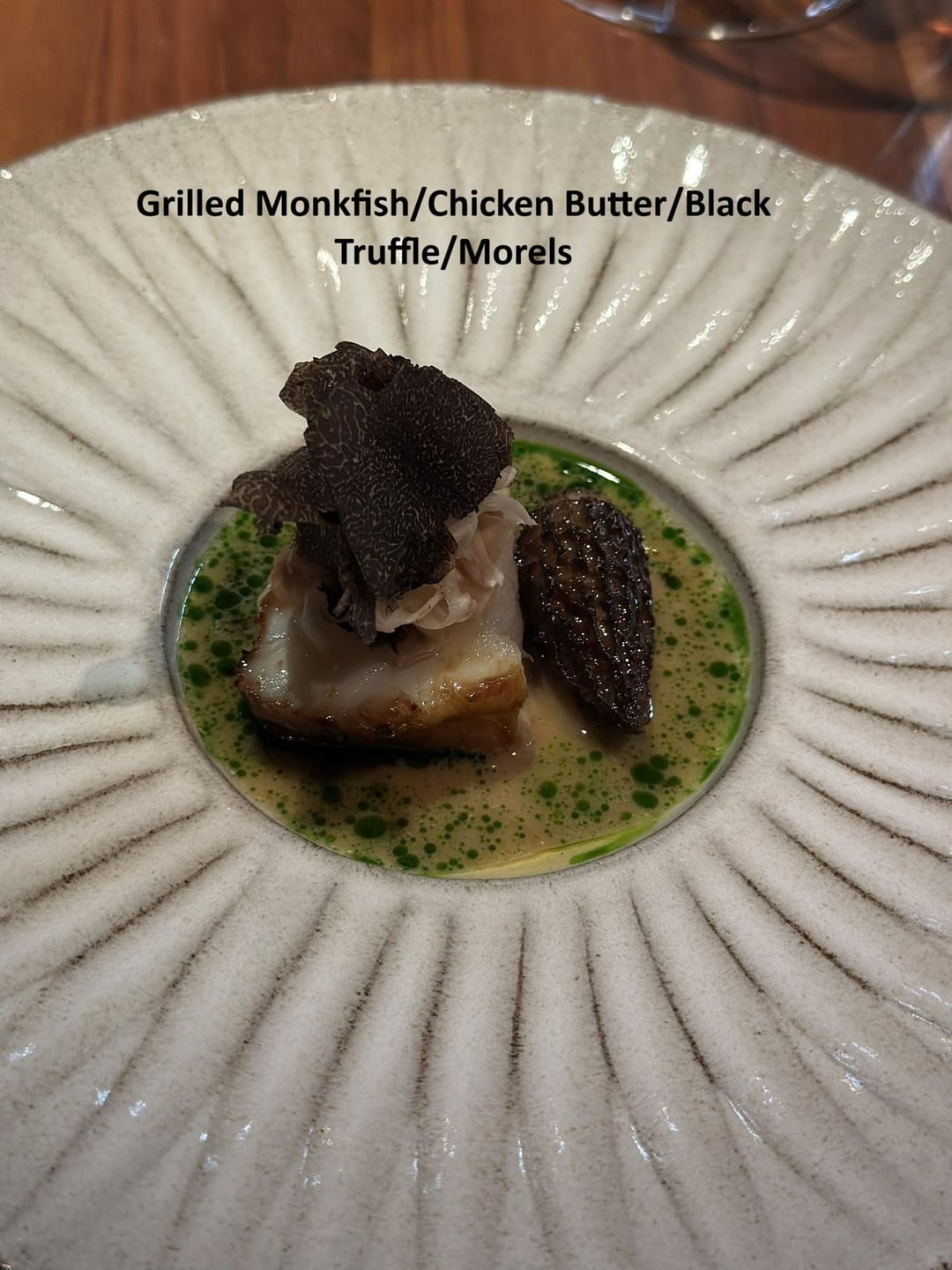 5) Arctic Cod from Lofoten/Walnut/Quince/Plum and Grilled Monkfish/Chicken butter/Black Truffle/Morels – following the langoustine, two fish entrees and both outstanding. The first a richer, creamier dish with light fruity touches to go with the fish while the second is a deeper, more savory take with a delightful piece of stuffed morel mushroom on the side. Both exhibited perfection in terms of the cook of the fish and flavors that all worked extremely well together within each dish but also offered some contrast in flavor on going from one course to the next. The monkfish, with its more meaty texture, also offered a nice bridge between the more delicate seafood the preceded it and the reindeer course that followed.