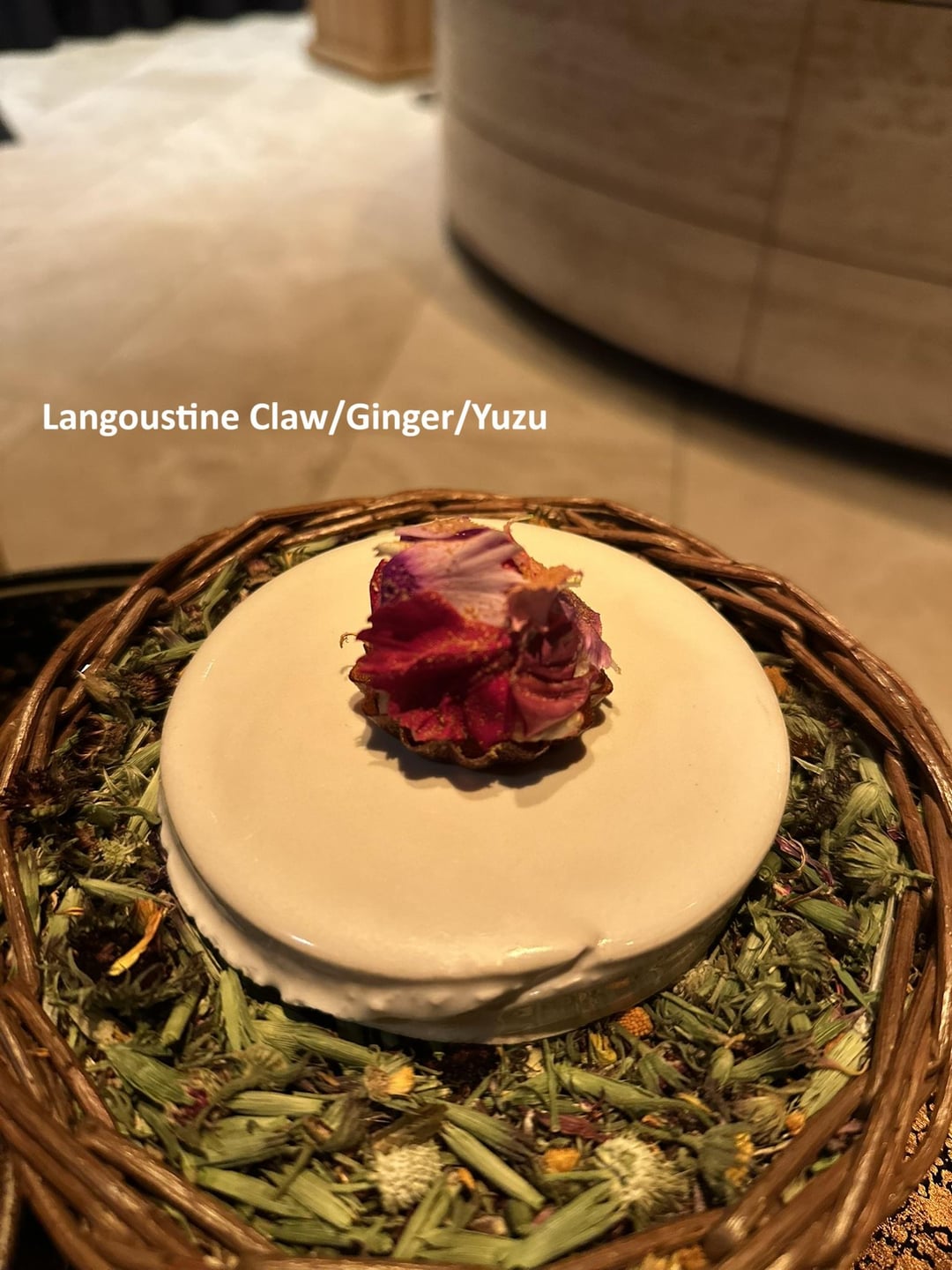 I observed one fascinating feature of the somms’ performance. In my experience at other restaurants, most somms present the bottle at the table and then pour the glass tableside. At Re-Naa, all the wines of the night are laid out at a long table by the bar where the somms pour the glass and then bring it to your table. As they waltz over to the table, however, they are constantly swirling the glass in their hand to aerate the wine. As a result, the aromas of the wine hit you as soon as the glass touches the table. While its nothing really out of the ordinary, it was just fascinating to see the somms serve a larger table where two or more somms descended upon the table in unison, swirling glasses in hand, almost like a dance they were conducting together.