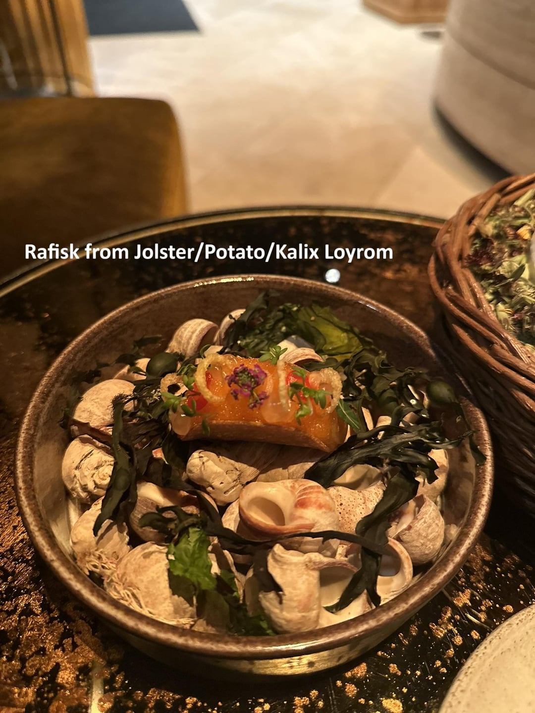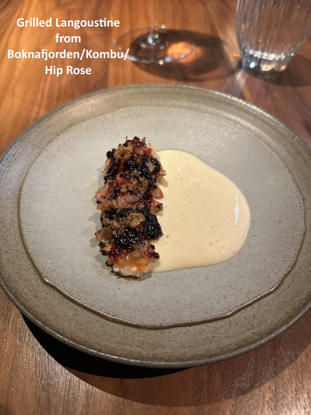 4) Grilled langoustine from Bjorknafjorden/Kombu/Hip Rose – nothing I say will do justice to how drop-dead delicious this dish is. When I’ve eaten langoustine previously, especially at Nordic restaurants, the formula seems to be to keep it simple and let nature’s bounty speak for itself. I agree with the philosophy, but the slight additions Re-Naa used here knocked it out of the park for me, more so than any iteration I’ve had before. The grilled langoustine is brushed with vinegar made from rose hip, topped with a crumble of sorts and served with absolutely the best version of a rich, creamy emulsion served alongside it is. It all makes for a memorable bite, an all-time great. The somm told me that they do a similar version with scallop instead, which is one of their favorites. I’d go back just to try whatever that version is. In my 3-week trip through UK, Copenhagen, Stavanger and Stockholm, this dish along with a seaweed custard served at L’enclume were the highlights for me. Magical.
