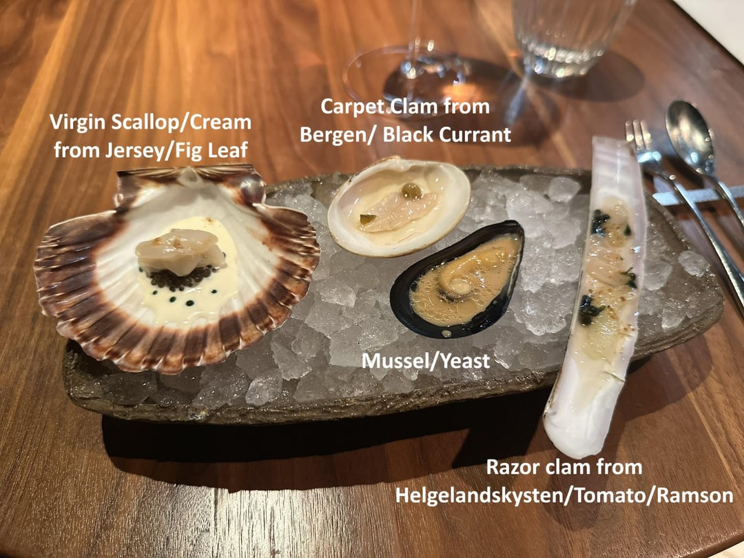3) Platter of Cold raw appetizers – after the sea urchin, the rest of the dishes of the second act were all served together on a platter. Showcasing the riches that Norway’s waters have to offer, it was recommended to eat them in order. Just a cohesive set of dishes, all immensely enjoyable and alternating between creamy and acid with every bite. The mussel was memorable using a sauce made from yeast that was especially satisfying.