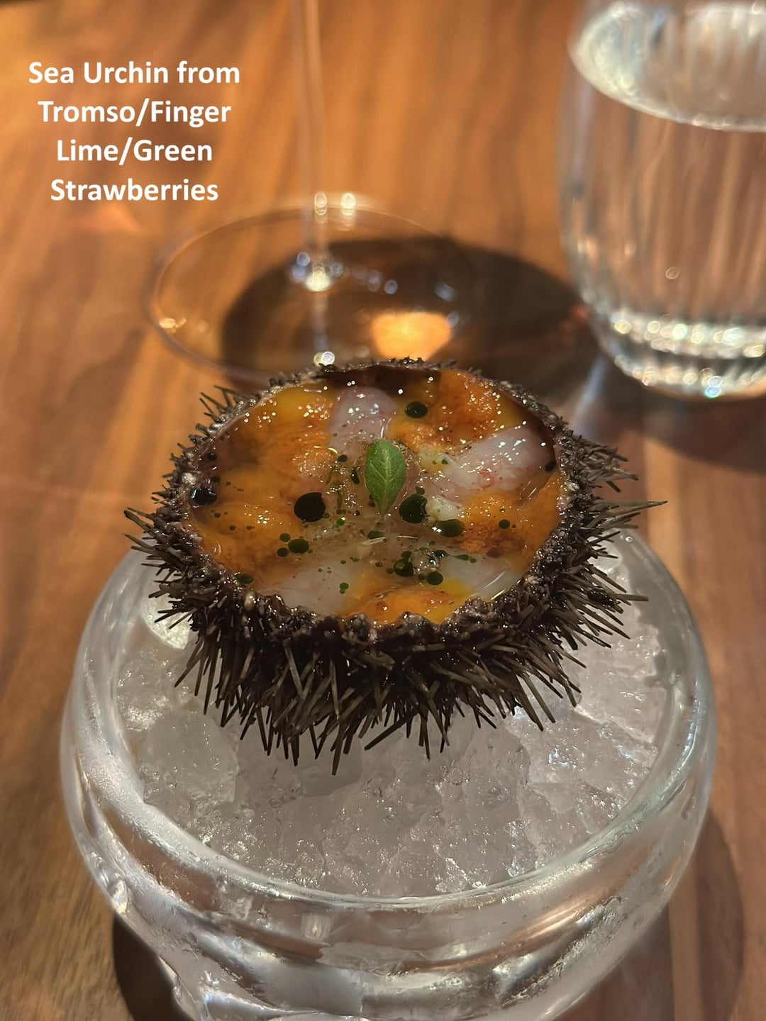 2) Sea urchin from Tromsø/Finger Lime/Green strawberries – few things are better than fresh sea urchin. In this case, an intensely appetizing dish that is packed with acid, creaminess and sweetness from the uni. Excellent way to kick of the cold, raw bites section.