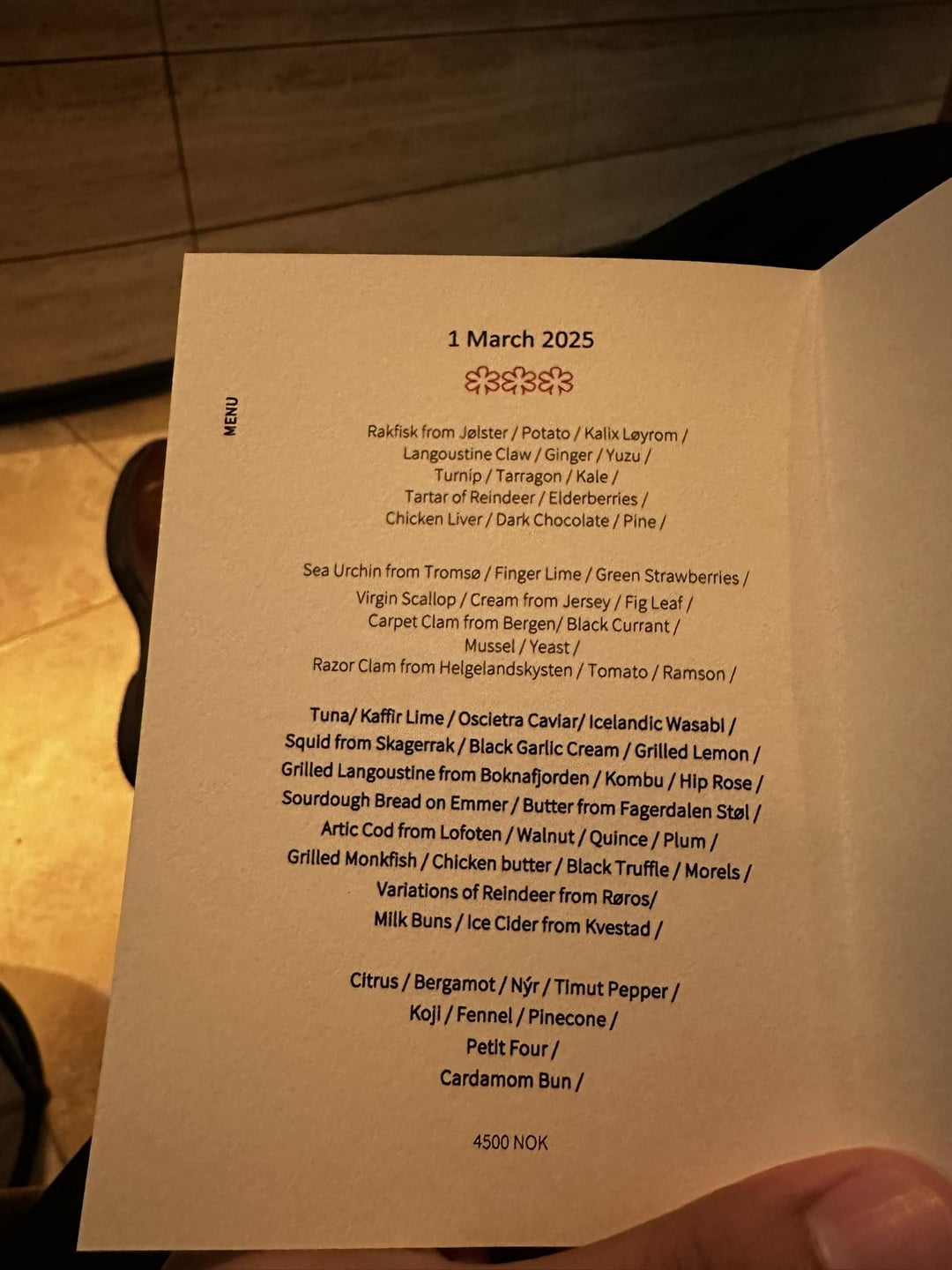 An absolutely deserved 3*, imo and one of my top Nordic experiences for sure. When comparing my experience here with Maeemo from the previous year, I might have to give the slightest of edges to Re-Naa. I’m partial to seafood, especially when it is executed this well, and personally also preferred Re-Naa’s dining room atmosphere. That said, if you find yourself planning a trip to Norway and are choosing between the two, you really cannot go wrong with either option. For those that prefer to focus on the mains of a tasting menu, Re-Naa is the place to score a reservation at. It’s where the restaurant really shines. Also, this menu is a ton of food!! You certainly will not complain about leaving hungry. I took my petit four to go because I was so stuffed.