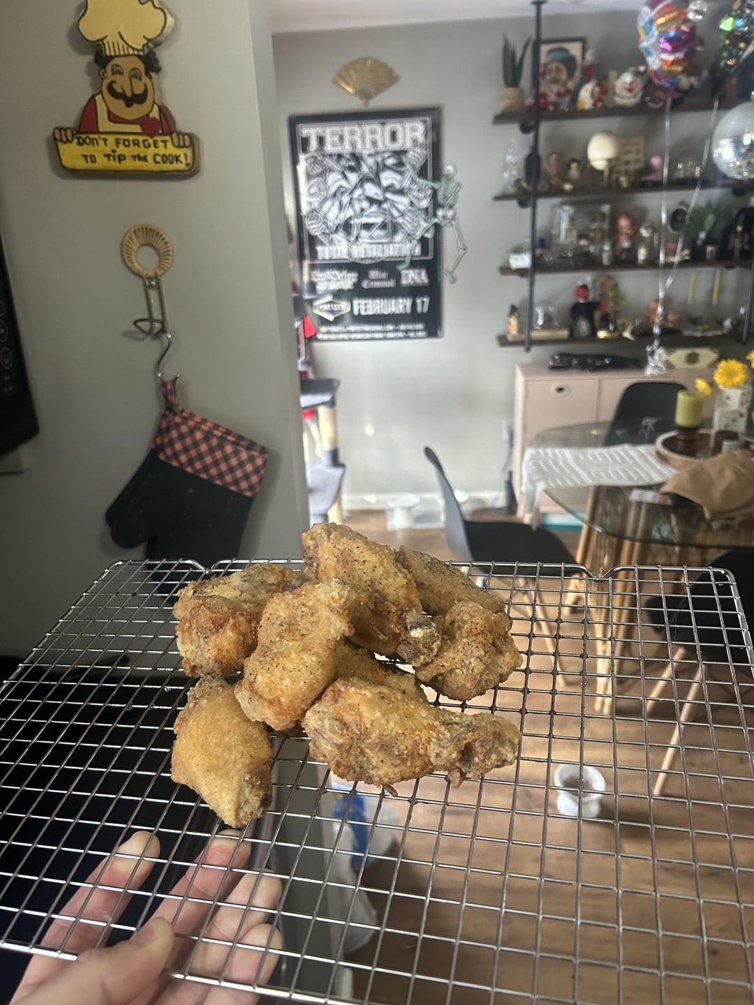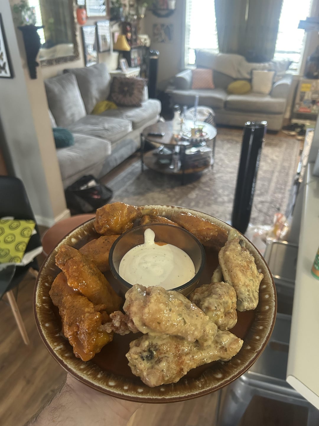 Typically I never even batter my wings, instead choosing to just fry them as is, but decided I wanted a change tonight. Dredged them in a mix of flour and corn starch (and yes, seasonings). 6 are just your typical Buffalo, 4 are Garlic Parm.