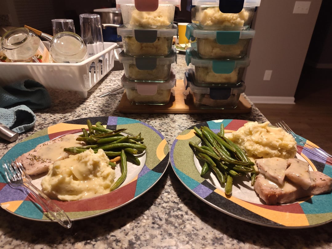 This week's dinner is lean center cut pork chops, mashed russet potatoes, and roasted green beans.