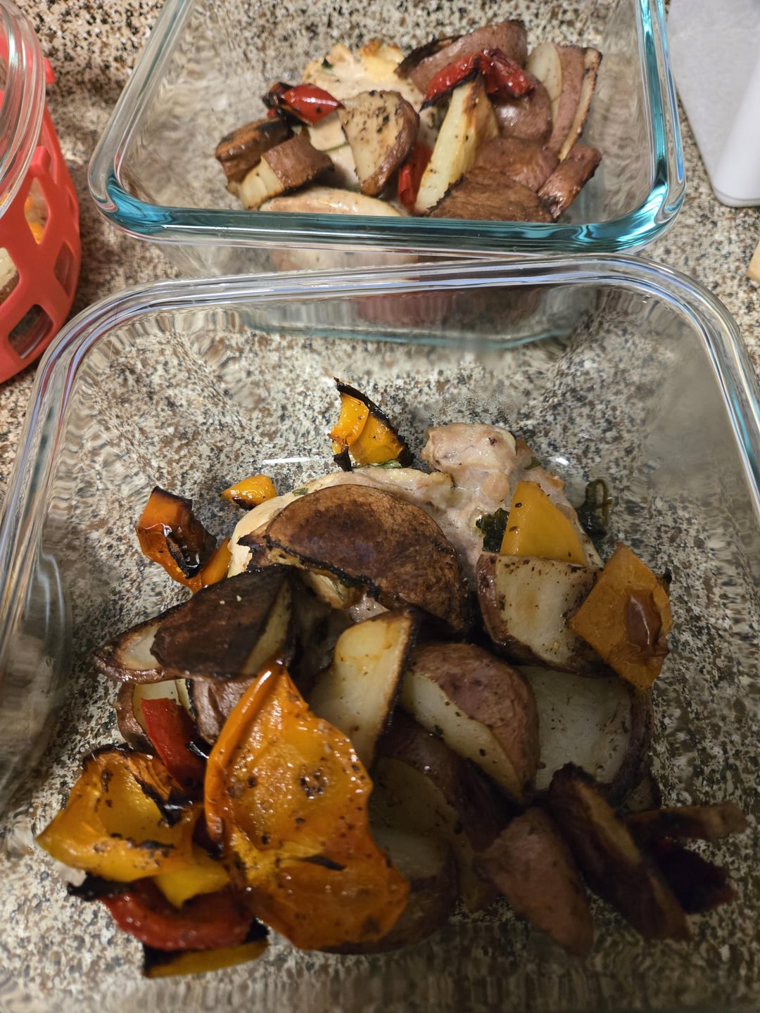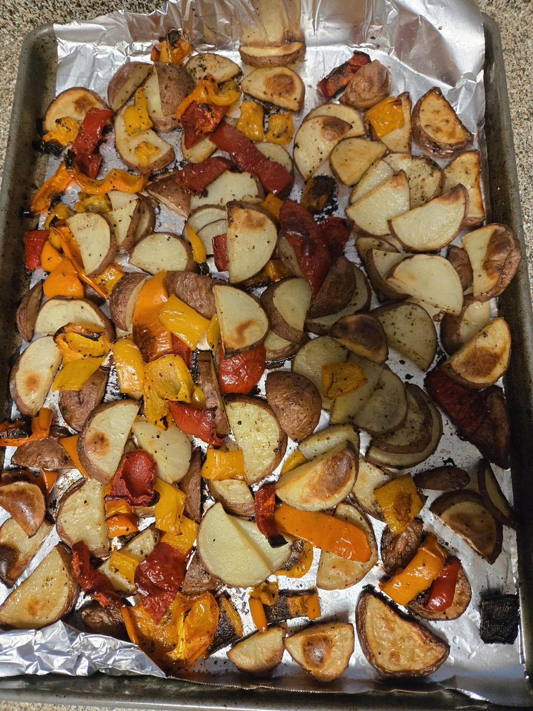 Chop potatoes and peppers and roast on sheet tray at 400 C for about an hour. Add salt pepper and olive oil.