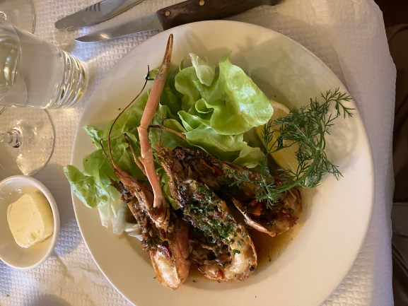 I’ll limit my review to the three courses I consumed. The introductory bread, a version of sourdough, was light, crusty and enhanced with what I think was Lurpack butter. Scrumptious, with repeat serves provided. The entree was scampi where the highlight was the sauce, rich, salty, more-ish, and well suited to savouring to the last drop via ‘mopping up’ with the aforementioned bread.