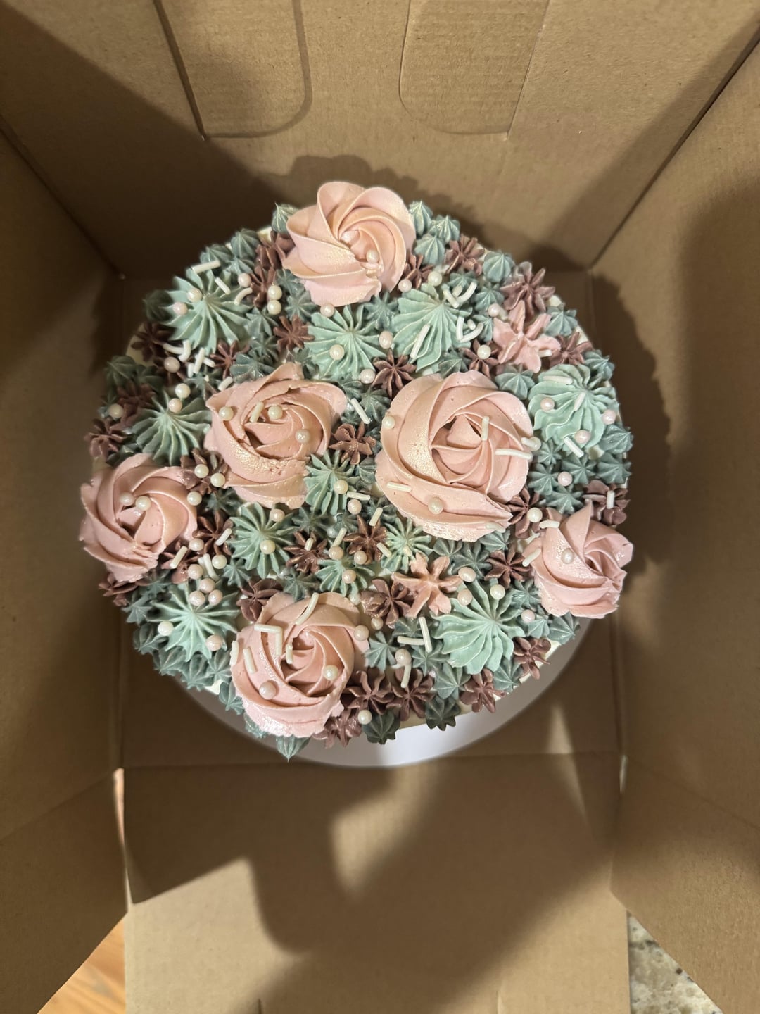 Not my typical style cake but I wanted to practice some piping. Ended up not being much practice cuz there were only a few rosettes but it ended up cute. Plus I made French butter cream for the first time 🤤