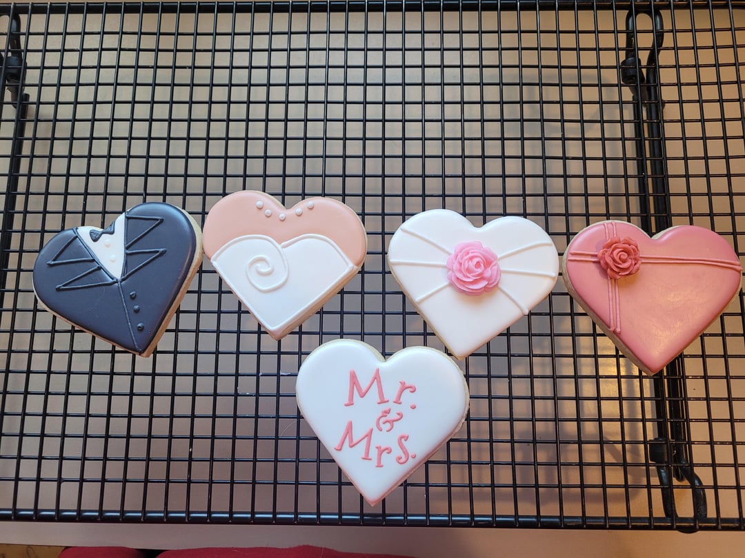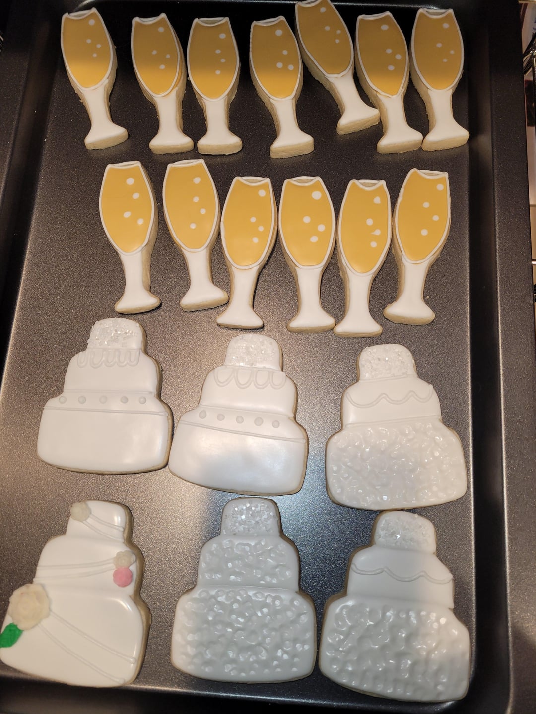 These were a fun set to make for a joyous occasion for us! They are all done w glaze icing. They were a hit and the wedding was beautiful and the reception lots of fun!!