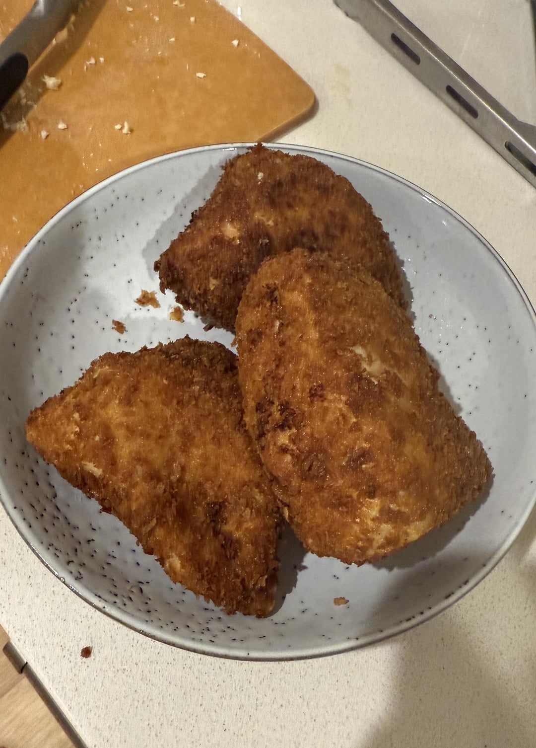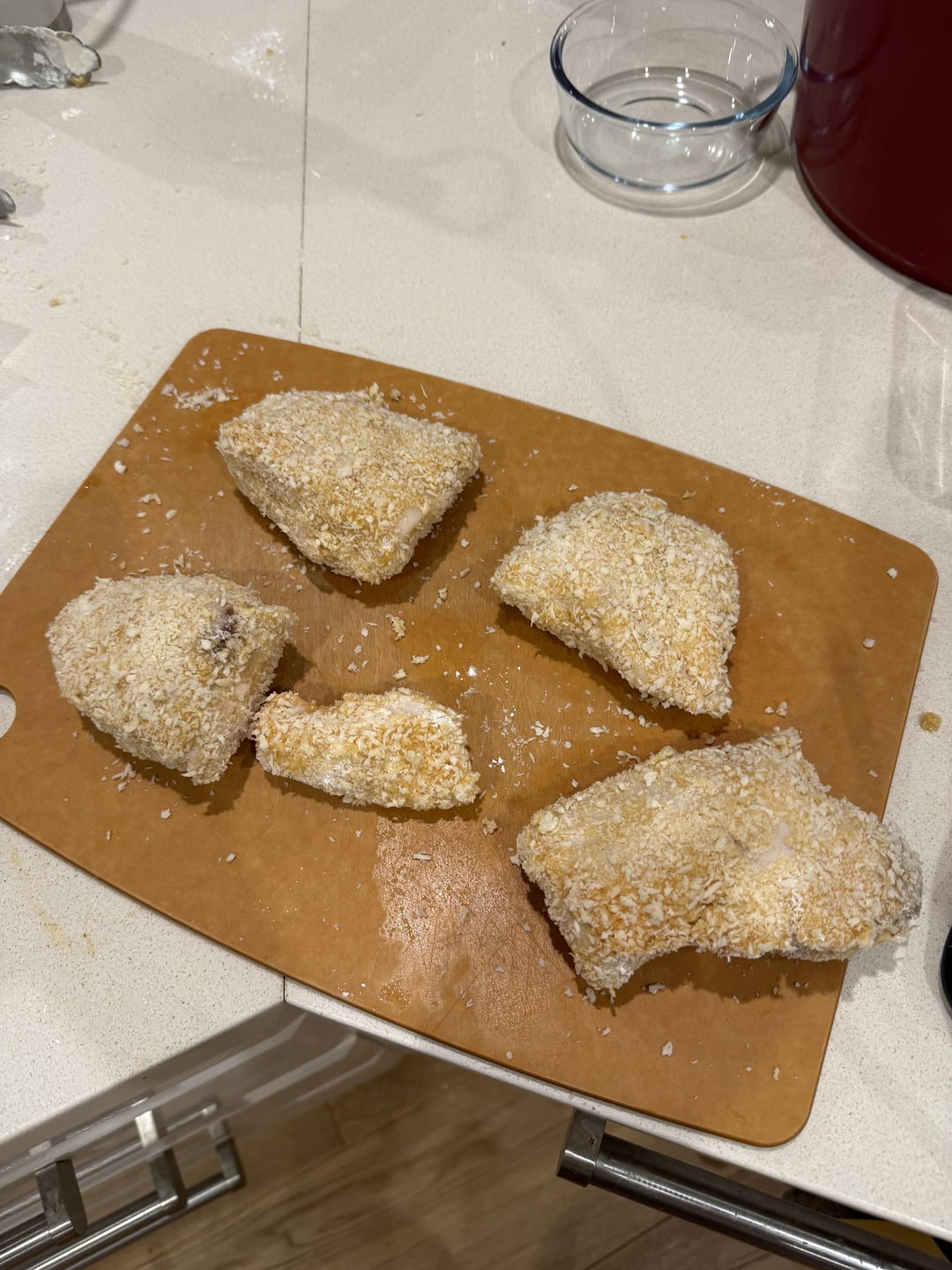 Looks good. Personally, I like my chicken thinner to make katsu. It makes things crispier and can keep the chicken juicy. Flatten with a mallet (which is just fun) before the bath and then bread and fry. Yum! Might have to make some tonight…